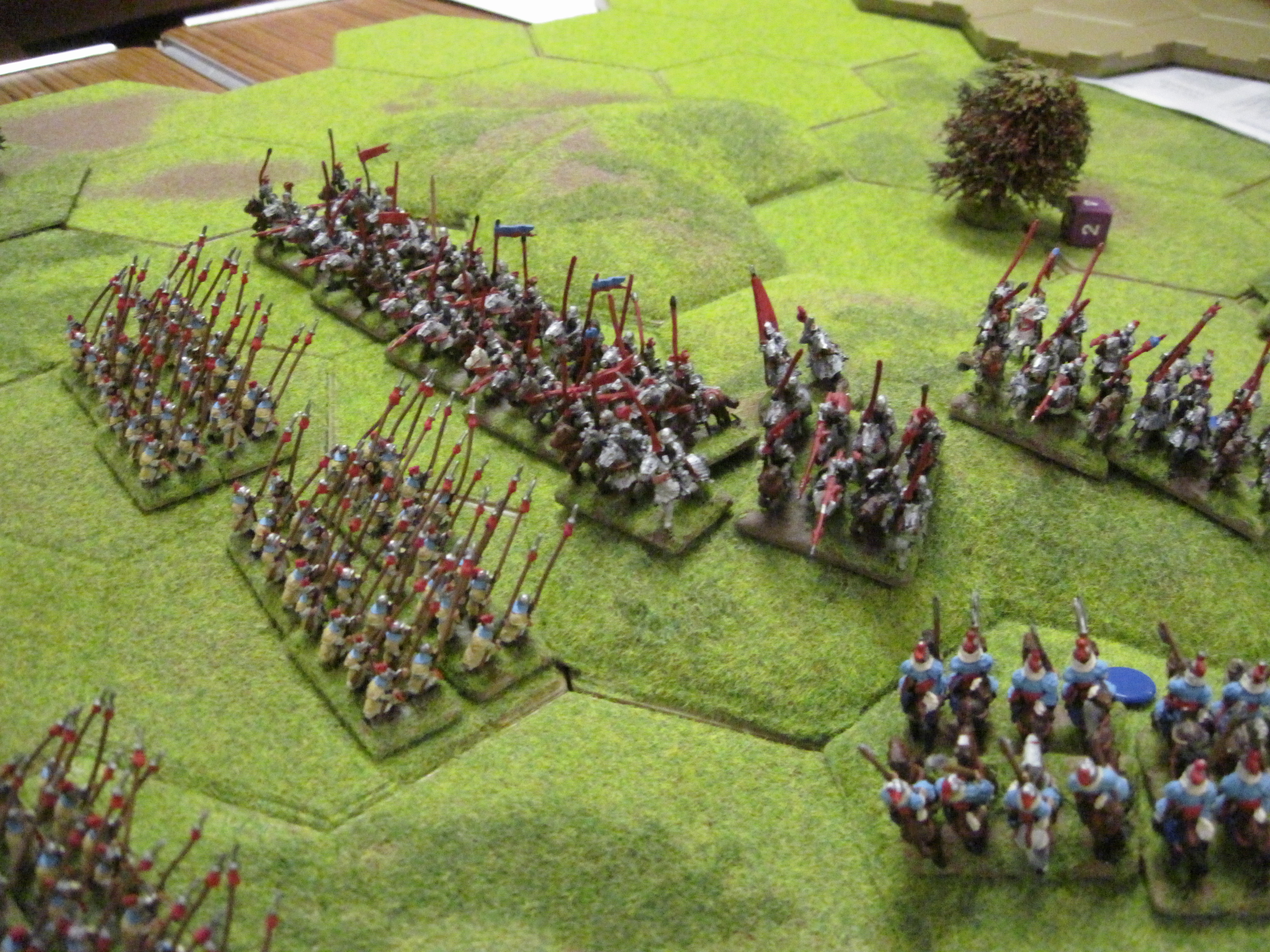 The Yorkist longbow defeat the Korean light cavalry and advance to occupy the 4-hex escarpment as the Koreans retreat.