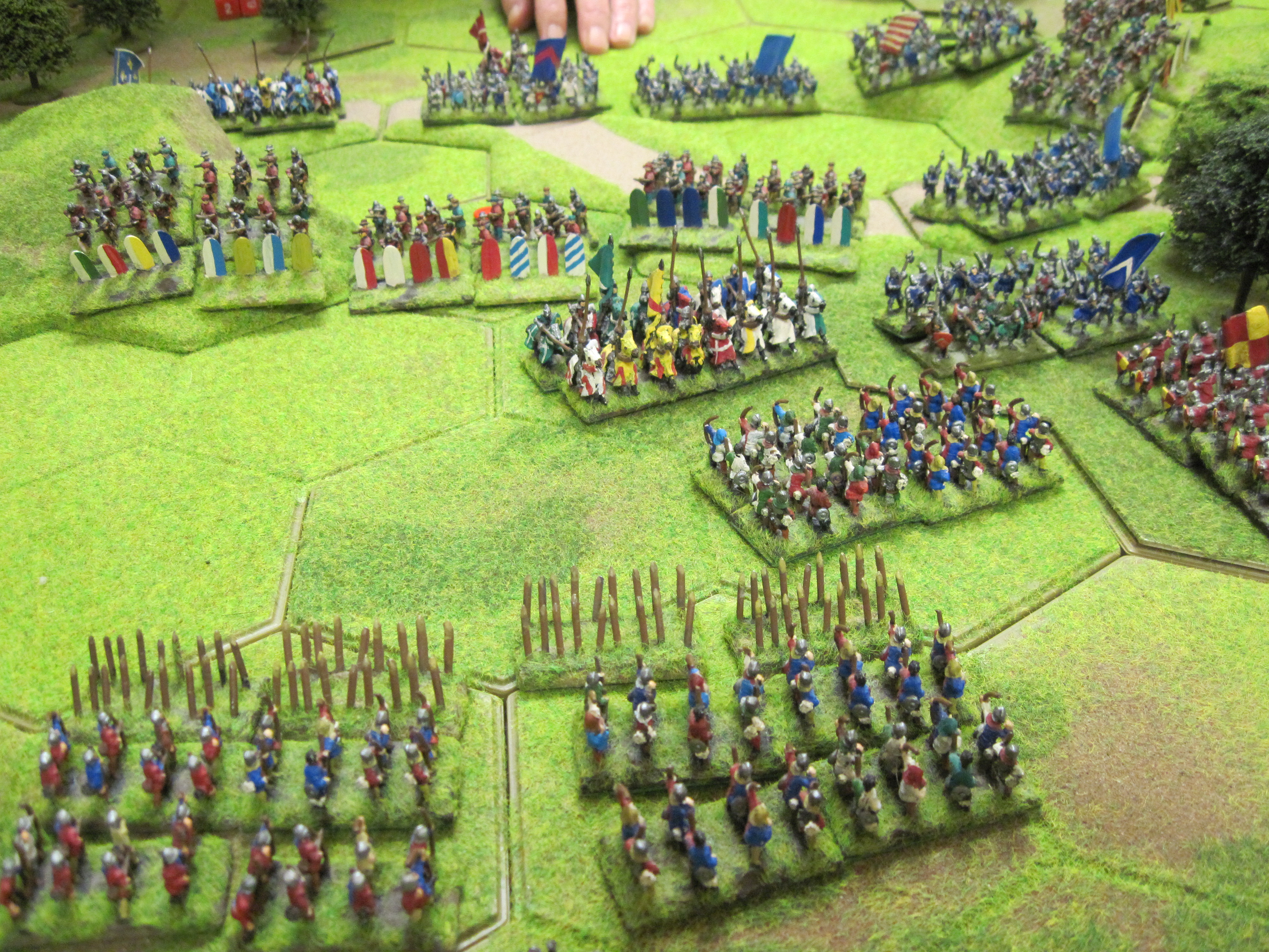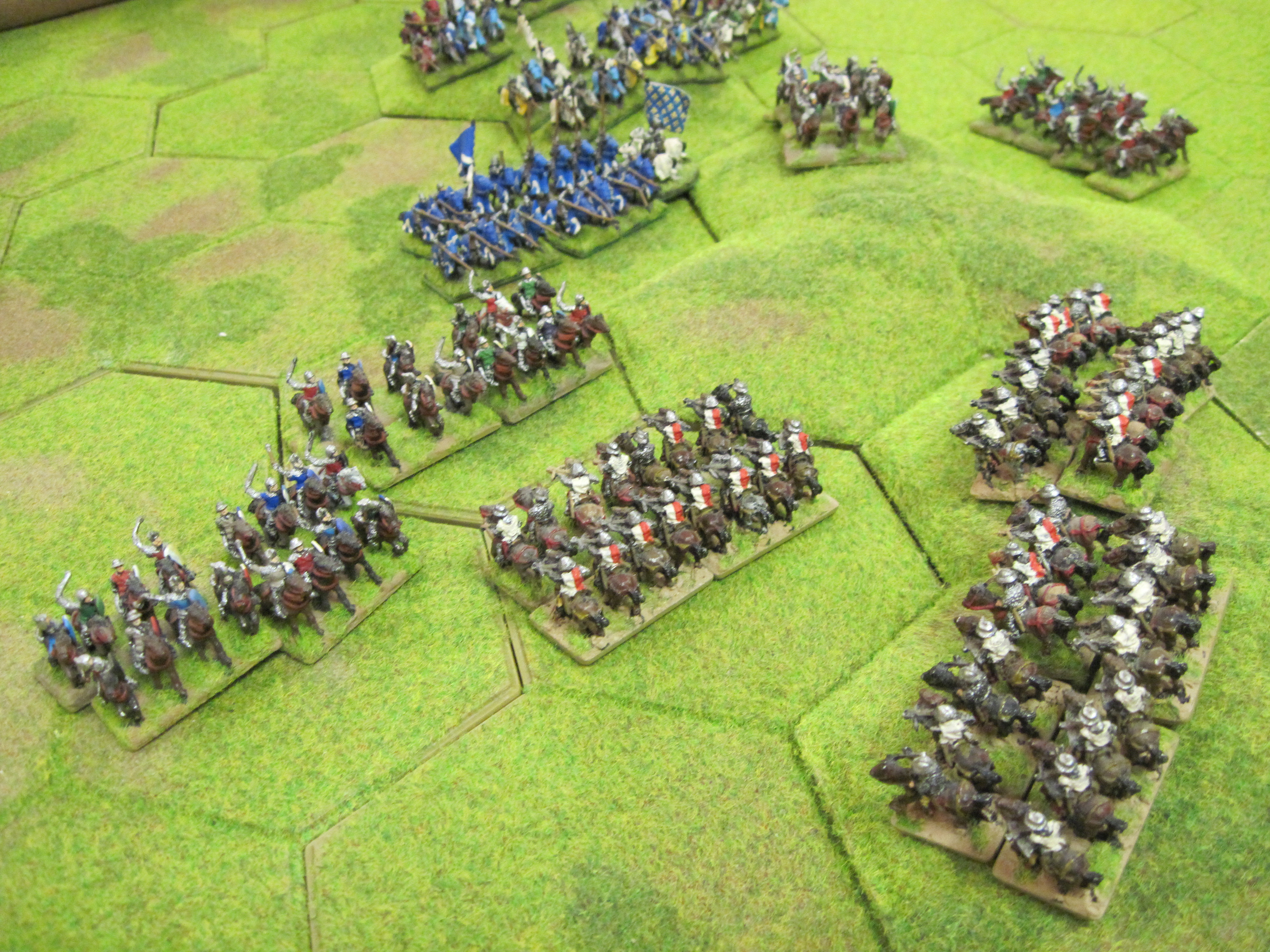 Mike and I had the French and Dave the Teutonic Order and the French won the di roll for choice of table edge which gave us the table edge with the most terrain features. The Teutonic army had control of the central open area of the table in which the mobile Teutonic mounted crossbow units would have control. However, French infantry occupying a 3 hex wood gave much needed protection to the French knights deployed in the centre. Mike deployed the French crossbows in a line behind their pavisses on the right of our line facing the Teutonic crossbows.