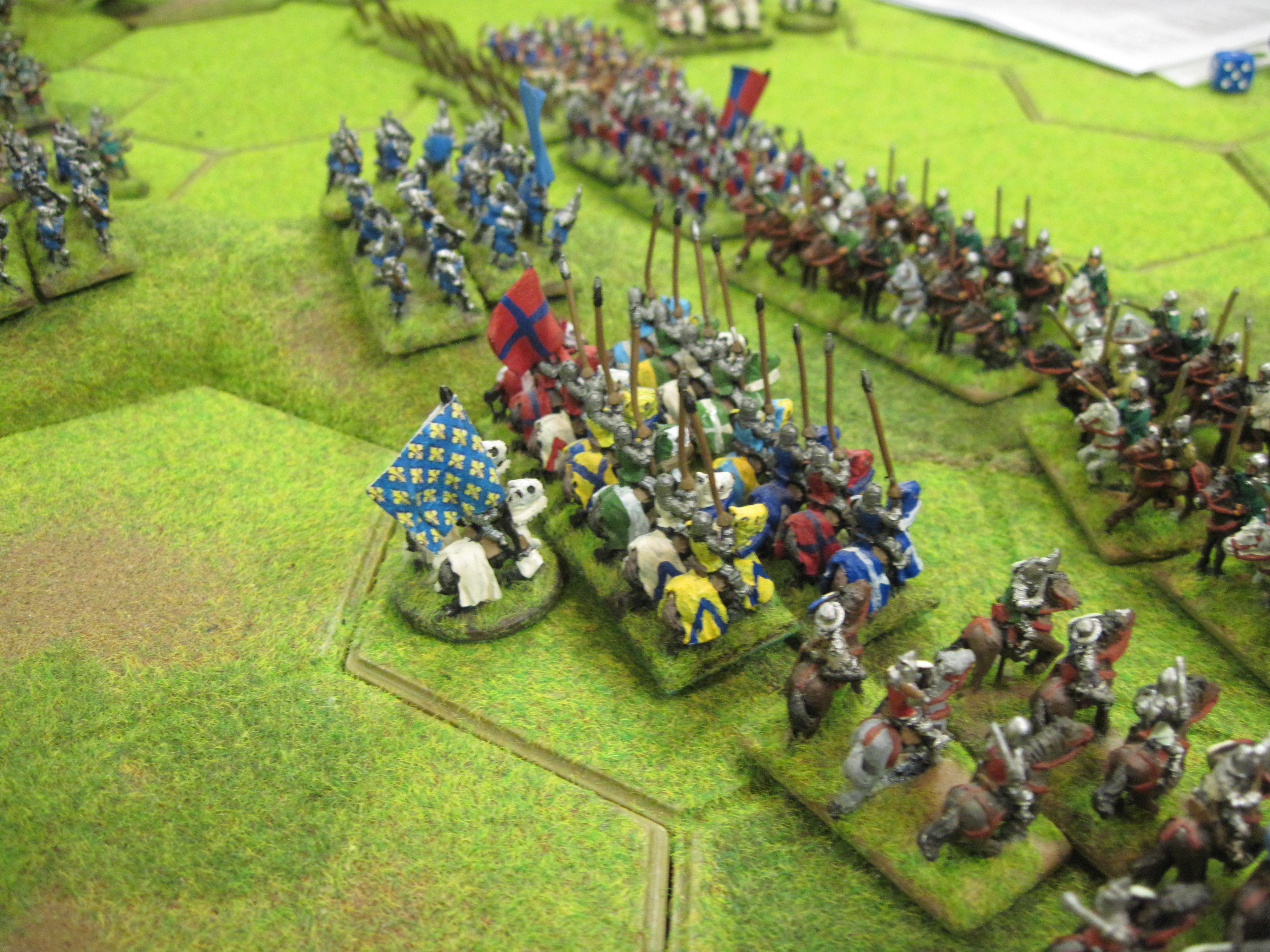In the next tactical movement phase Mike and I were able to advance our infantry to support the French cavalry. Again, with notable help from the dice gods we defeated the Teutonic knights and mounted crossbow and started to move against the Teutonic infantry. The Teutonic spearmen and crossbow units were still very much still present, organised and far from defeated. However, after taking a general overview of the situation, Dave decided that with the loss of the cavalry the Teutonic army was facing unavoidable defeat, so the game concluded.