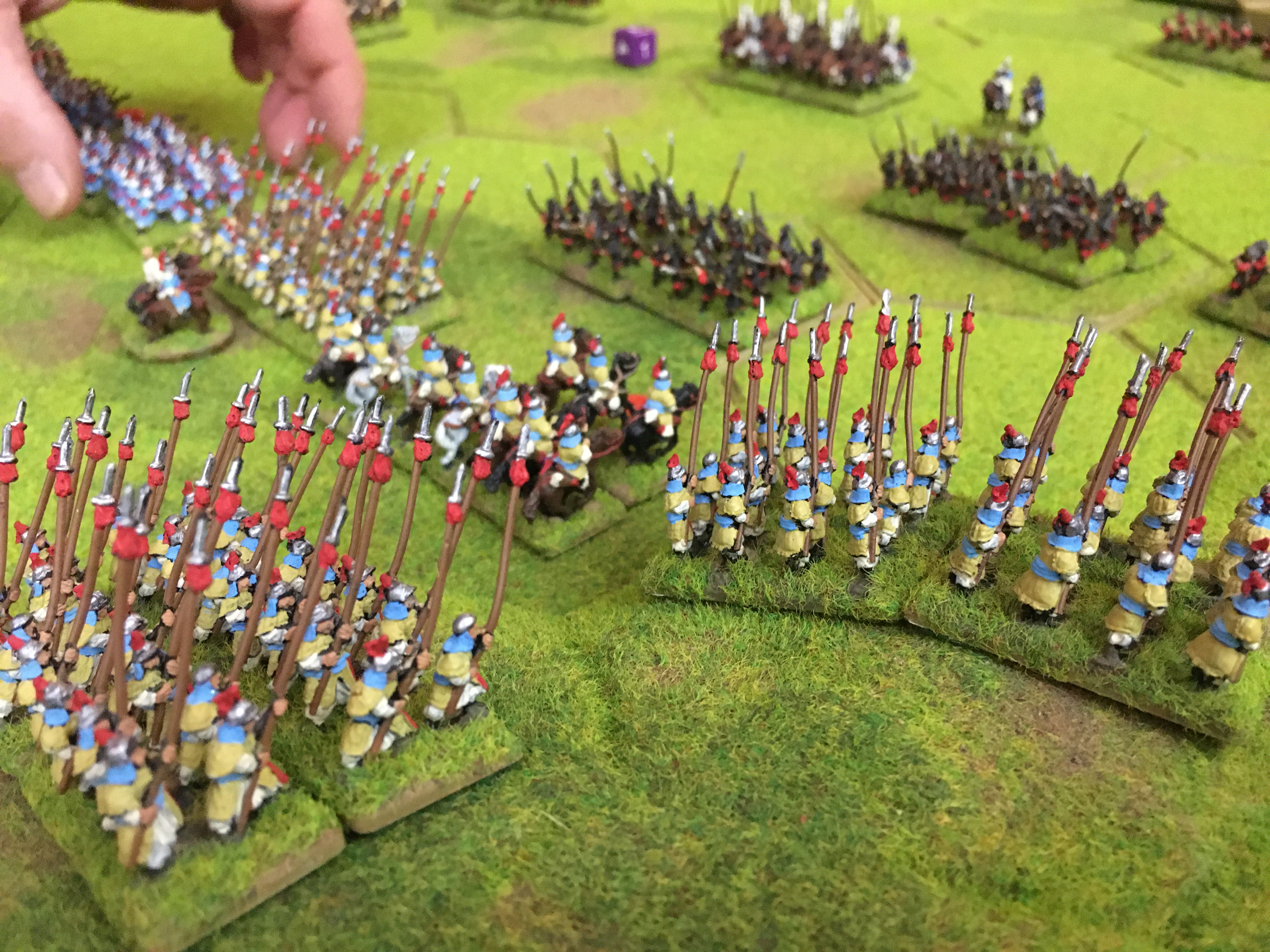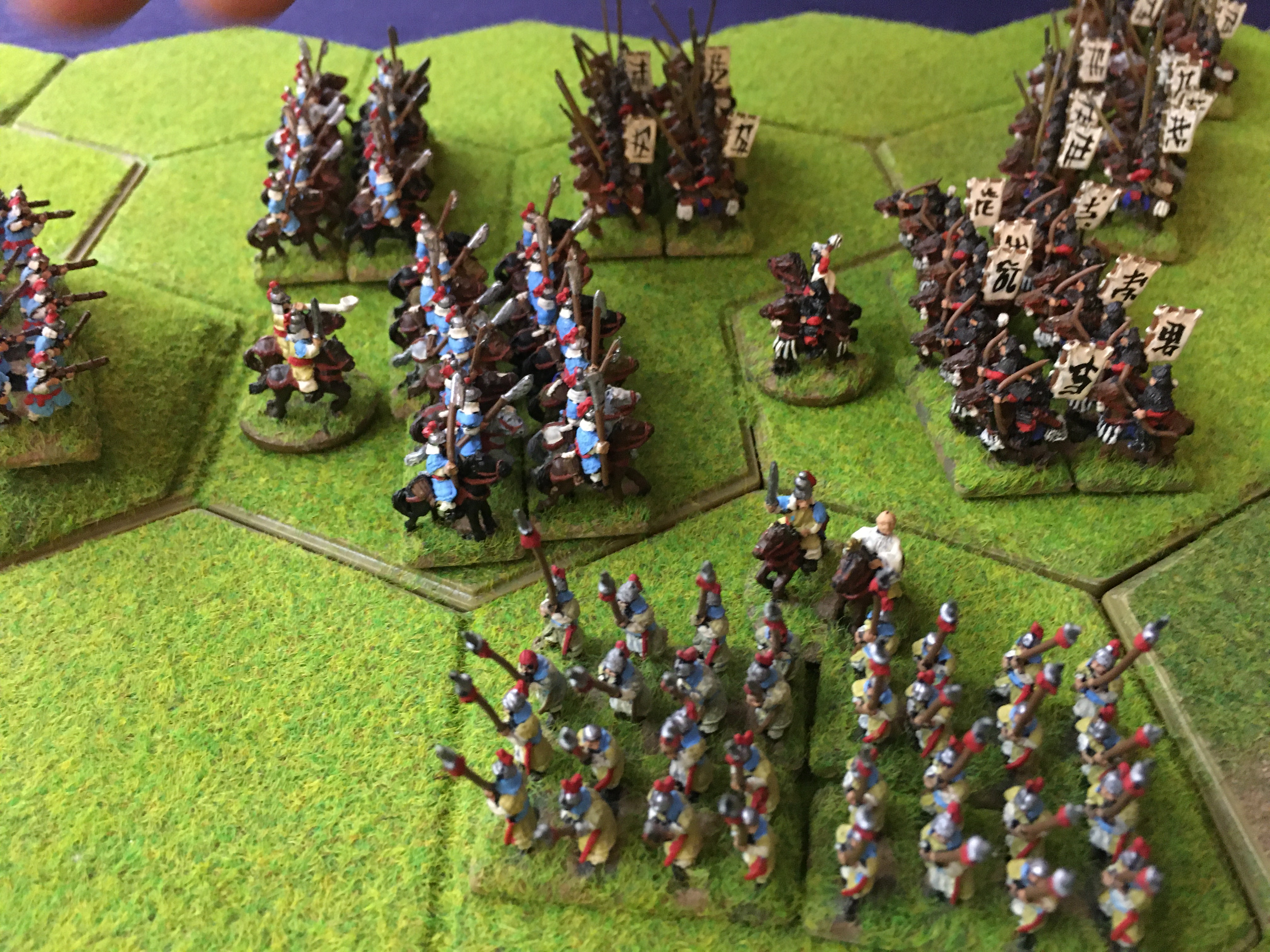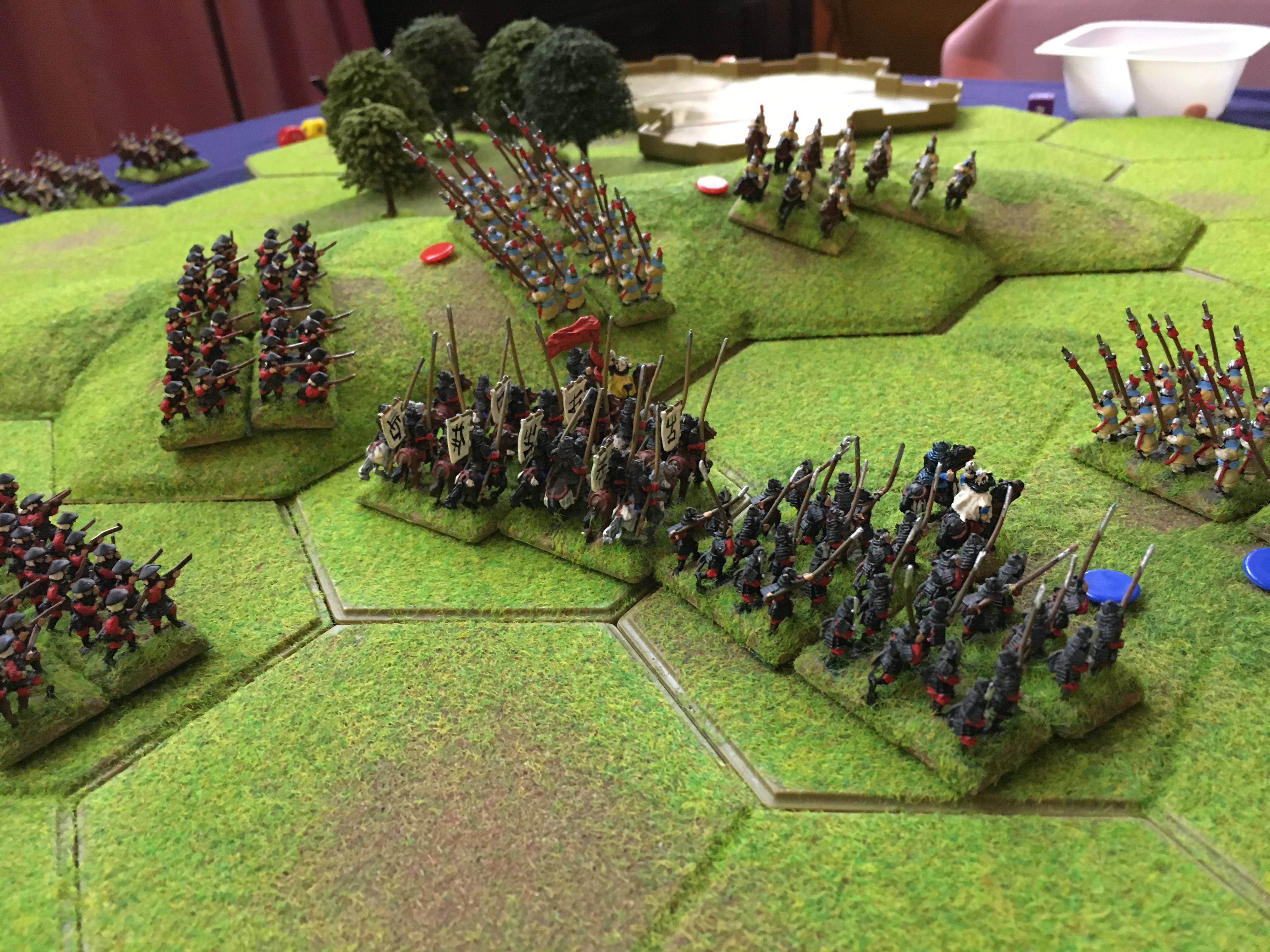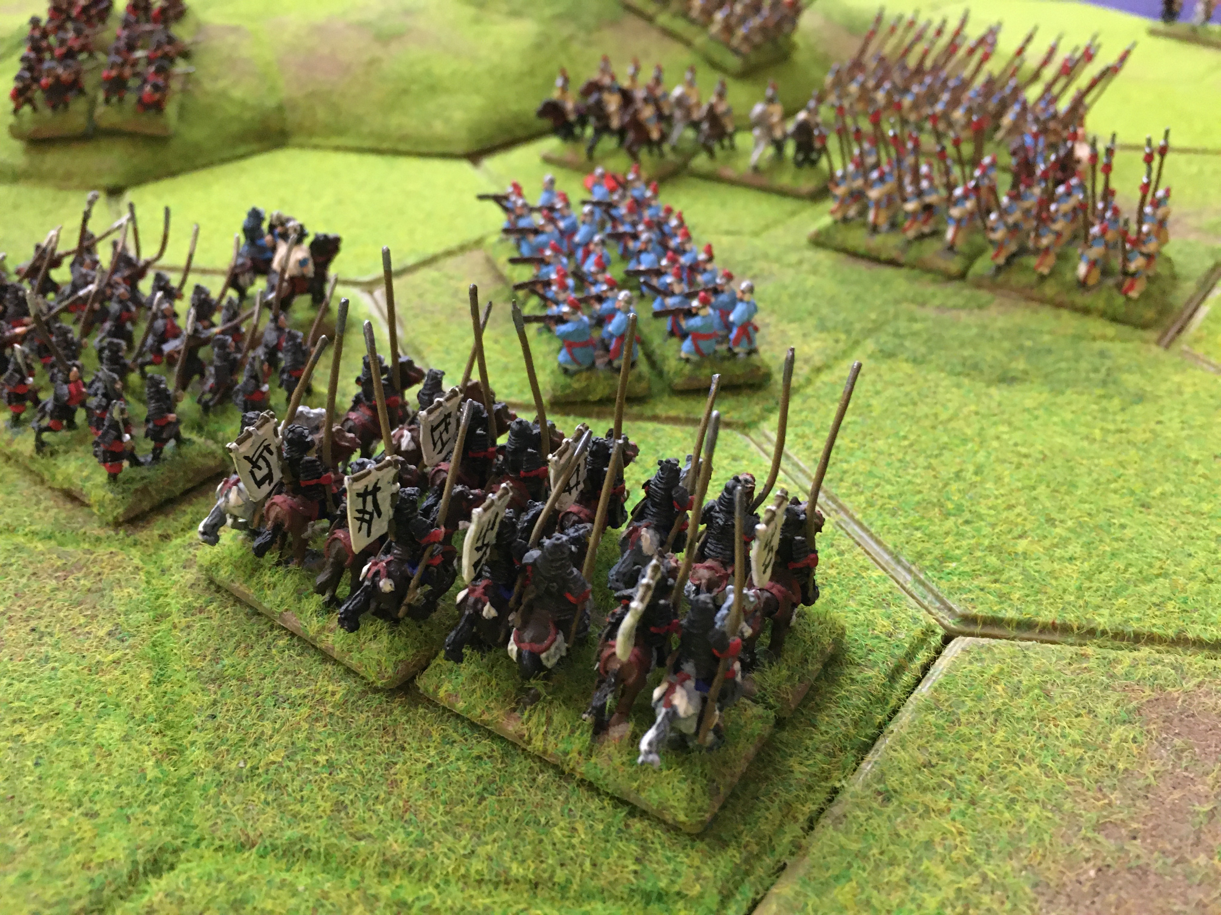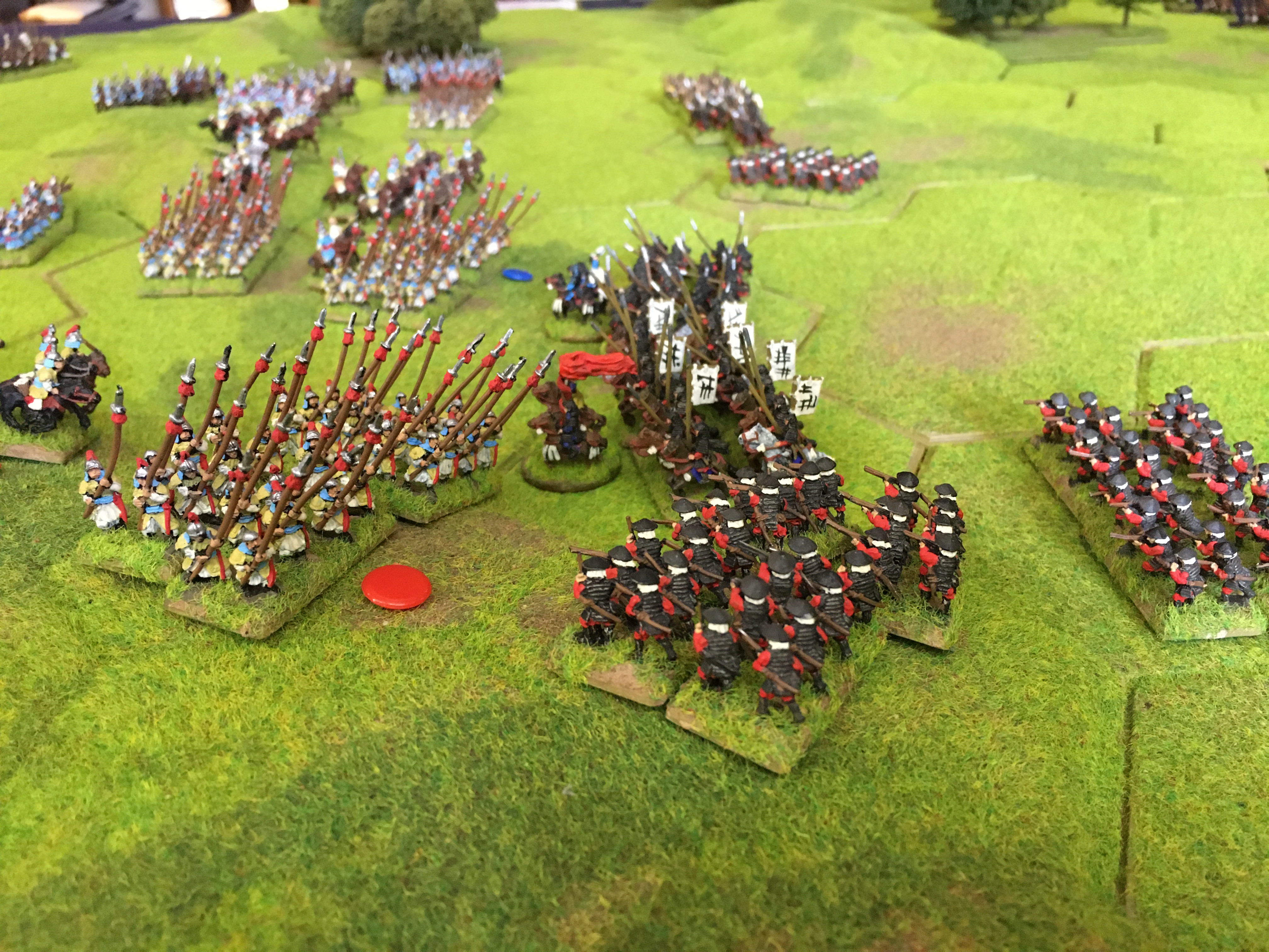 Alex also halted his line and then sent 5 units of mounted Samurai towards the ‘North end’ or my left wing to circumnavigate around the aforementioned 4 hex wood. This was a clear attempt to get behind my left and rear and in response I had to switch my 3 units of heavy cavalry and a unit of spearmen to plug the gap between the wood and my table edge.