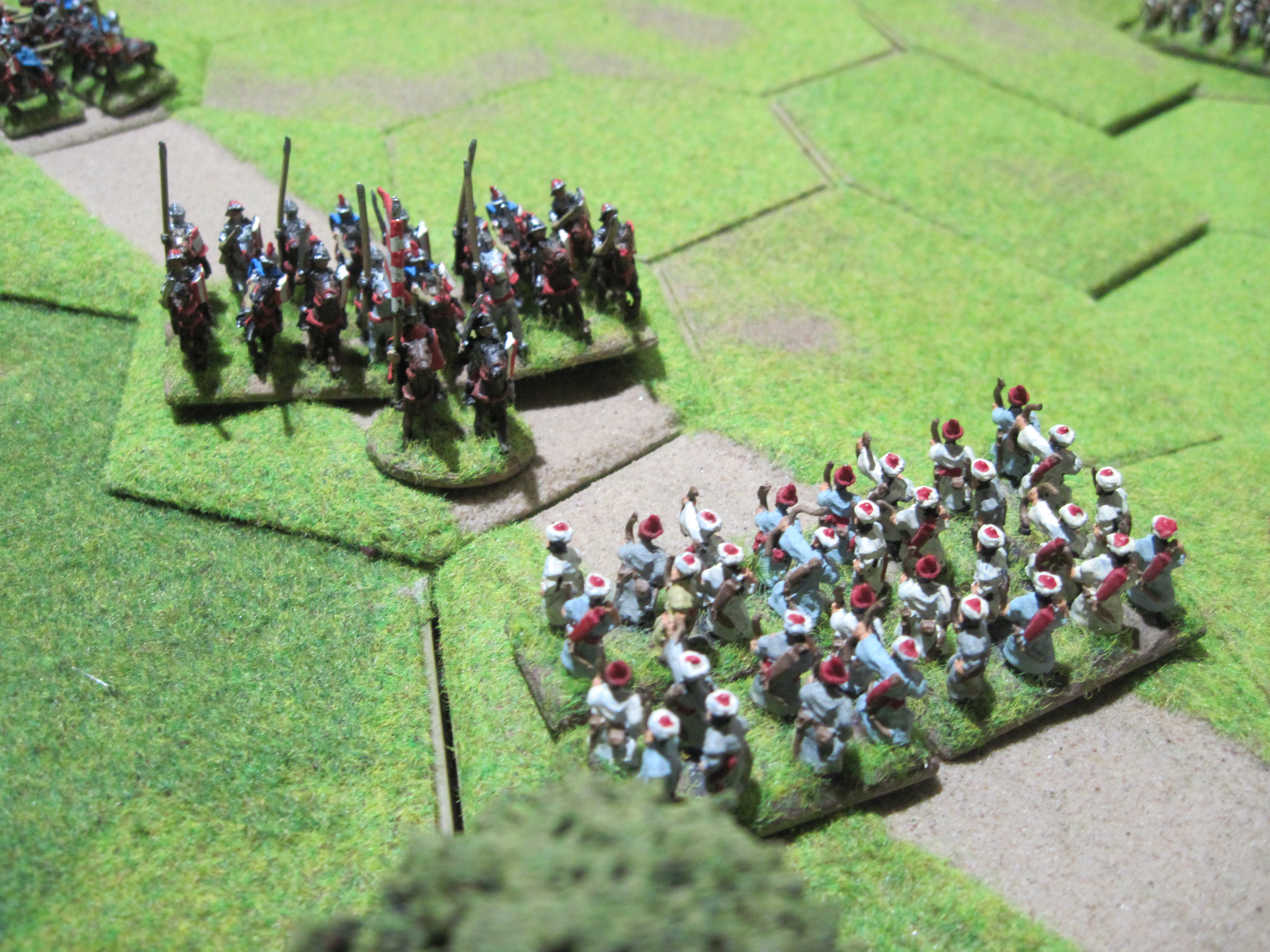 The Ottoman army was typical of the period with nine units of Sipahis and Akinci bow-armed light and medium cavalry and large numbers of infantry consisting of azab archers and spearmen. In contrast, the Hungarian army had 9 units of heavy cavalry accompanied by a mixed infantry force of archers, crossbows, two units of warwagons and accompanying handgunners. Because of the relatively high points of the heavy cavalry, to bulk up the numbers, the Hungarians had 6 units of peasants at only 3 points per unit. This balanced the points cost of the 2 armies at 275 points and also brought the number of units in each army to a more even balance.