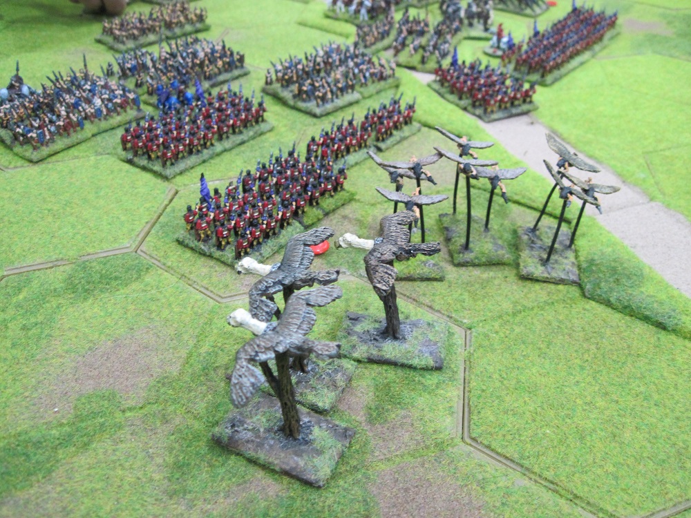 In the centre my wizard again failed to evoke a fire elemental and in response Chris landed 4 hits with his ballistae which was demonstrating the accuracy of a modern ground to air missile launcher as rolls of 11 or 12 on a D12 dice were becoming the norm!