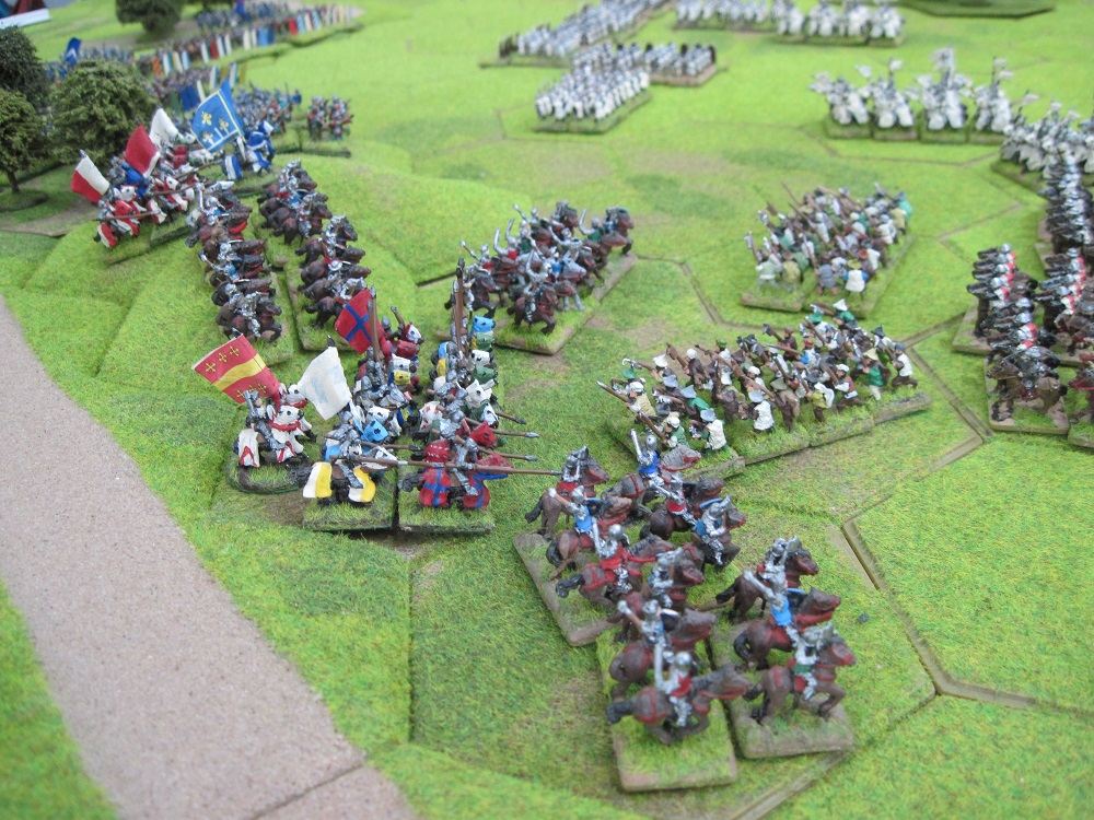 Tony, won the di roll for first move and he quickly advanced to take possession of the 2 areas of woodland between which he deployed his 5 units of French crossbow with pavisses to the fore! He concentrated 7 of his 8 units of cavalry on his right wing along with 2 of his 3 generals. In response, Tim matched up his 4 units of crossbow with Tony’s, again with pavisses in front. Behind these he created a mixed line of Teutonic spears knights and 2 units of mounted crossbow. However, more significantly his line of crossbow was extended using 5 units of peasant militia which created a sacrificial block against any potential French massed cavalry charge.