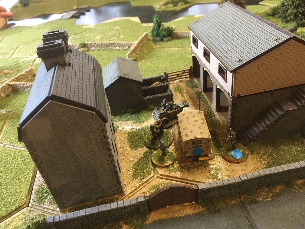 In this scenario the German force has launched a counter-attack with the aim of re-taking a French village. The Brits have placed mines on both of the roads leading to the centre of the village including directly in front of the stone bridge crossing the small river. Two German commands, Callum in charge of one and I the other advanced on either side of the river. The British defenders under the control of Micky and Tony had carefully positioned 6pdr anti-tank guns and infantry units with ‘ambush’ orders. Dave had the role of game coordinator.