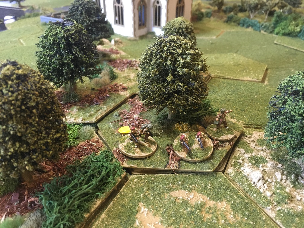 Meanwhile, on the other side of the river my 3 panzer IV’s were soon reduced to 2 as one was shot at and failed a morale test which resulted in the crew abandoning their tank. These cowardly unfortunates were soon cut down by small arms fire from the concealed British infantry leaving me with a perfectly functioning tank but no crew. Having quickly lost 2 vehicles, Callum and I decided to disembark our infantry sections from their transports and advance them on foot taking advantage of any available cover. Unfortunately, my infantry attempting to capture the wooded area adjacent to the village church received a very severe mauling from British infantry waiting in ambush both within the woodland and occupying the church.