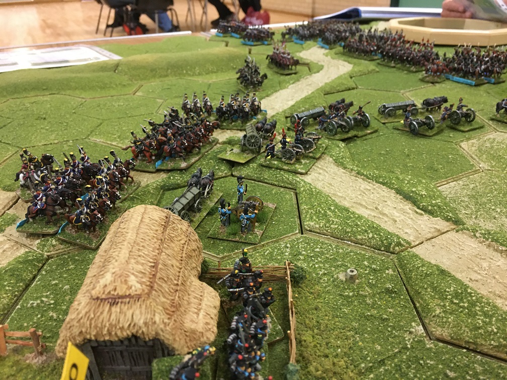 In response the French commanders, Tony and Chris, deployed their artillery adjacent to the village where these batteries could receive supporting musketry fire from the occupying infantry. It was time for the Russian Cossacks to lead the assault with the heavy cavalry units following up behind.
