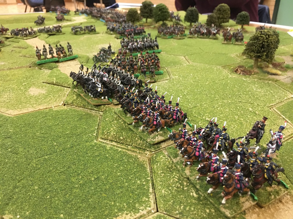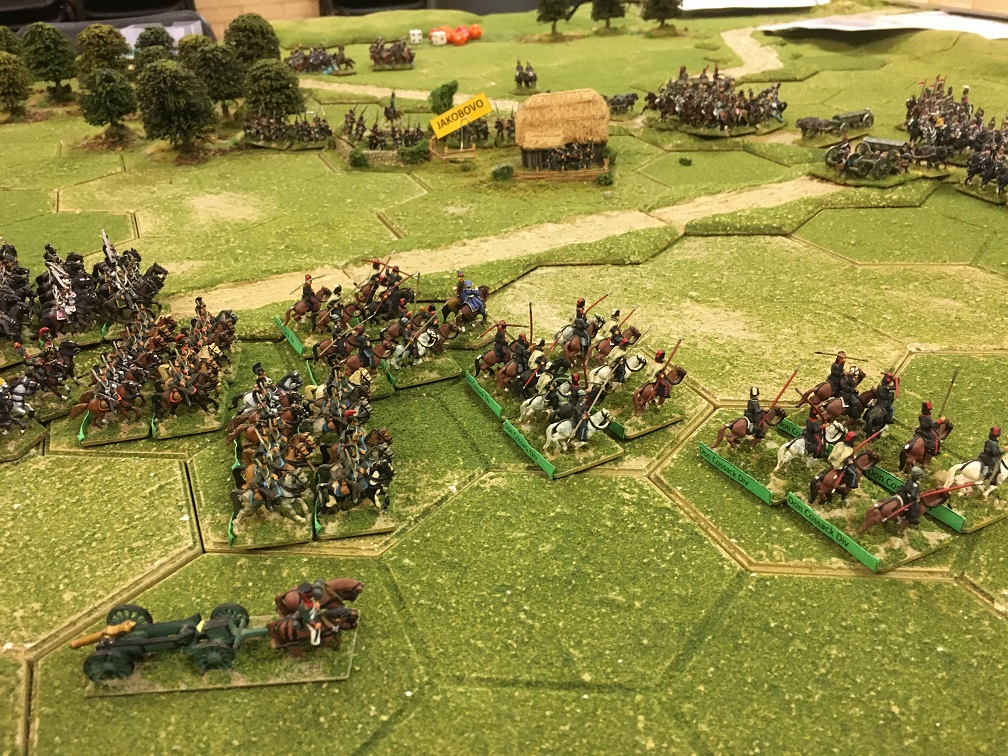 Another large force of French cavalry appeared, this time with heavy dragoons and cuirassiers. They needed some substantial opposition, which arrived in the form of Russian heavy cavalry units advancing along the road towards the village which was now firmly in French hands.