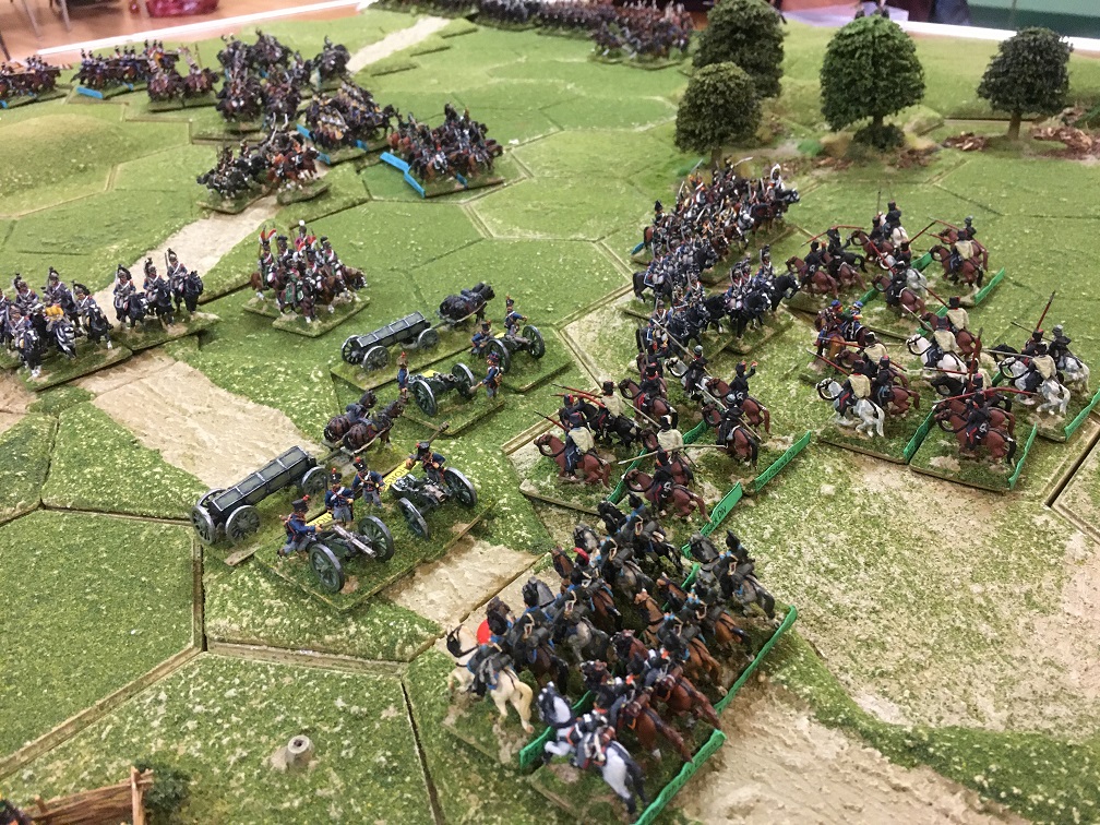 The Cossacks supported by a unit of Russian light dragoons charged the guns. This was sacrificial in many ways, but it did pave the way for the Russian cavalry to engage their French counterparts in what turned into an epic struggle. After initial French success the Russian heavy cavalry supported by Tim’s light units gained the upper hand forcing the French squadrons back.