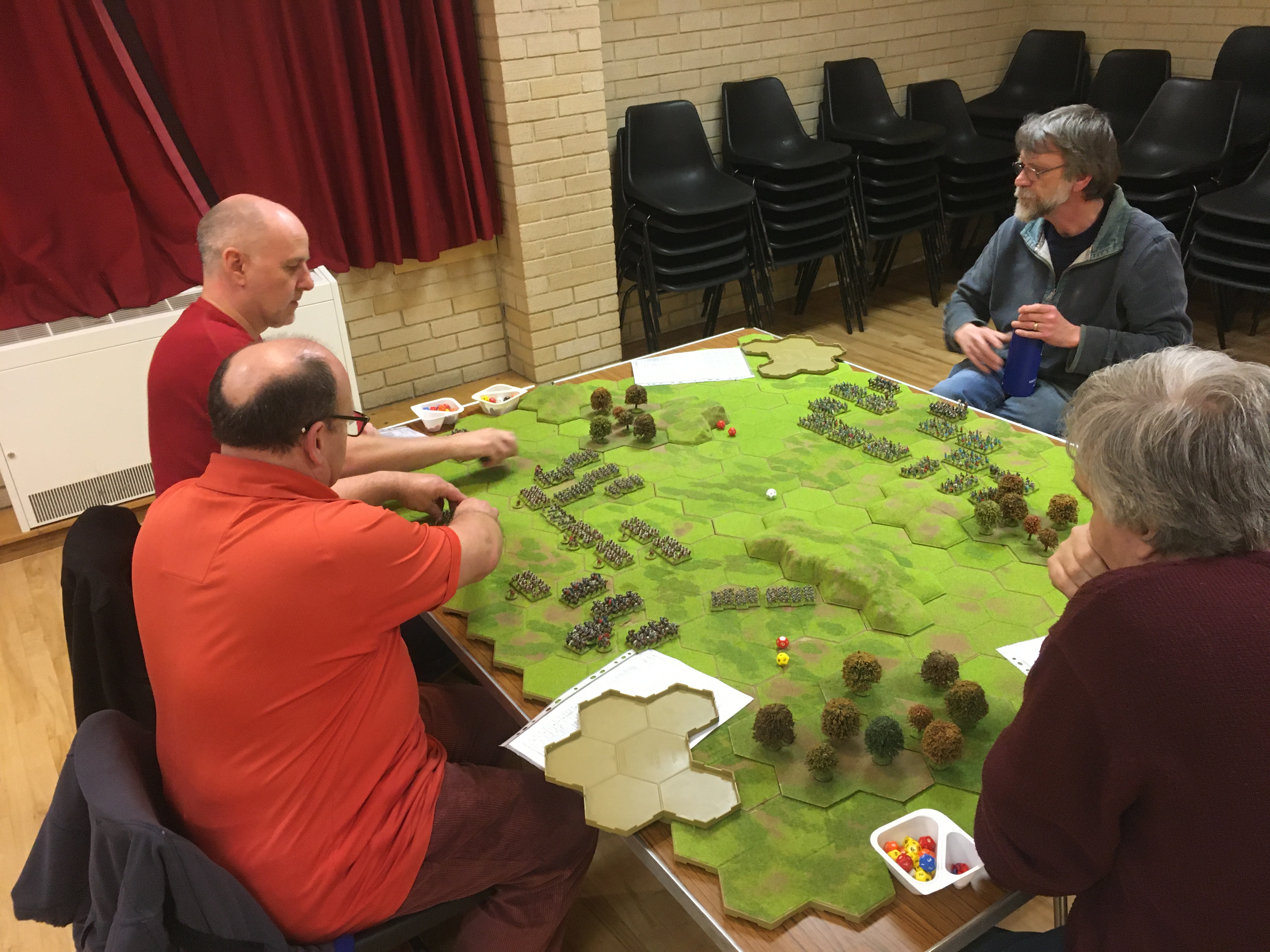 We let the dice decide that Tony, James and Chris commanded the Romans and Tim and I the Dacians. The choice of table edge gave Tim and I the slightly more advantageous table edge with the steep slope of an 8 hex escarpment facing the Romans on our left. A scattering of small areas of woodland punctuated the rest of the table with a 4 hex escarpment located within easy reach of a Roman advance.