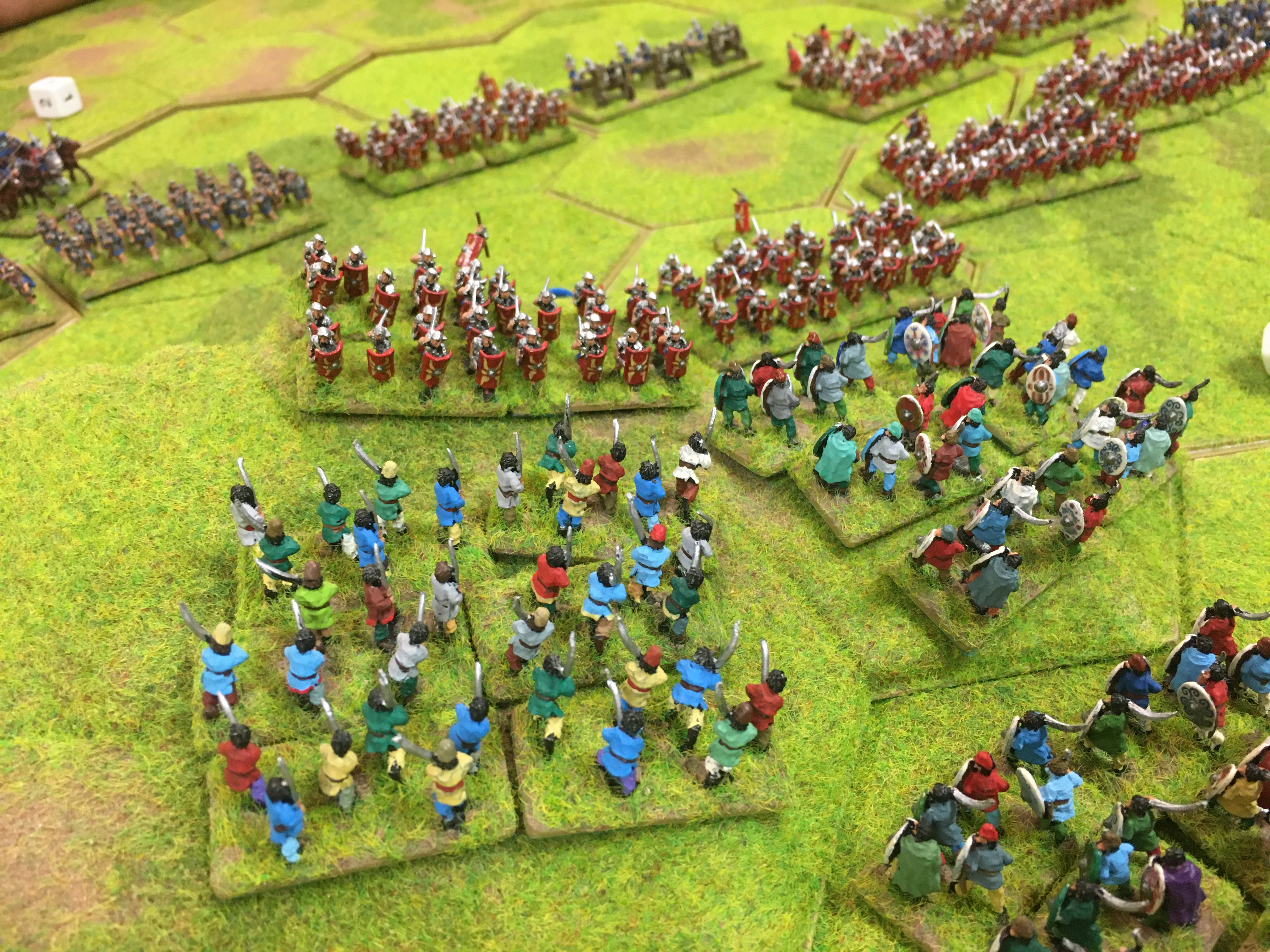 Tim and I decided to pull back away from the Auxillaries but confront the Legionaries head on in the centre. The cavalry confrontation went decidedly in favour of our Dacians which gave us full control of the 8 hex escarpment where we proceeded to line up our archers. These well positioned missile troops then engaged in a shooting match with Roman archers from the protection of the escarpment ridge line. The resulting shooting and hand-to hand combats all favoured the Dacians. This resulted in the opportunity to trap in combat and demolish 3 of the 4 Roman cavalry units and force the Roman archers to retreat.