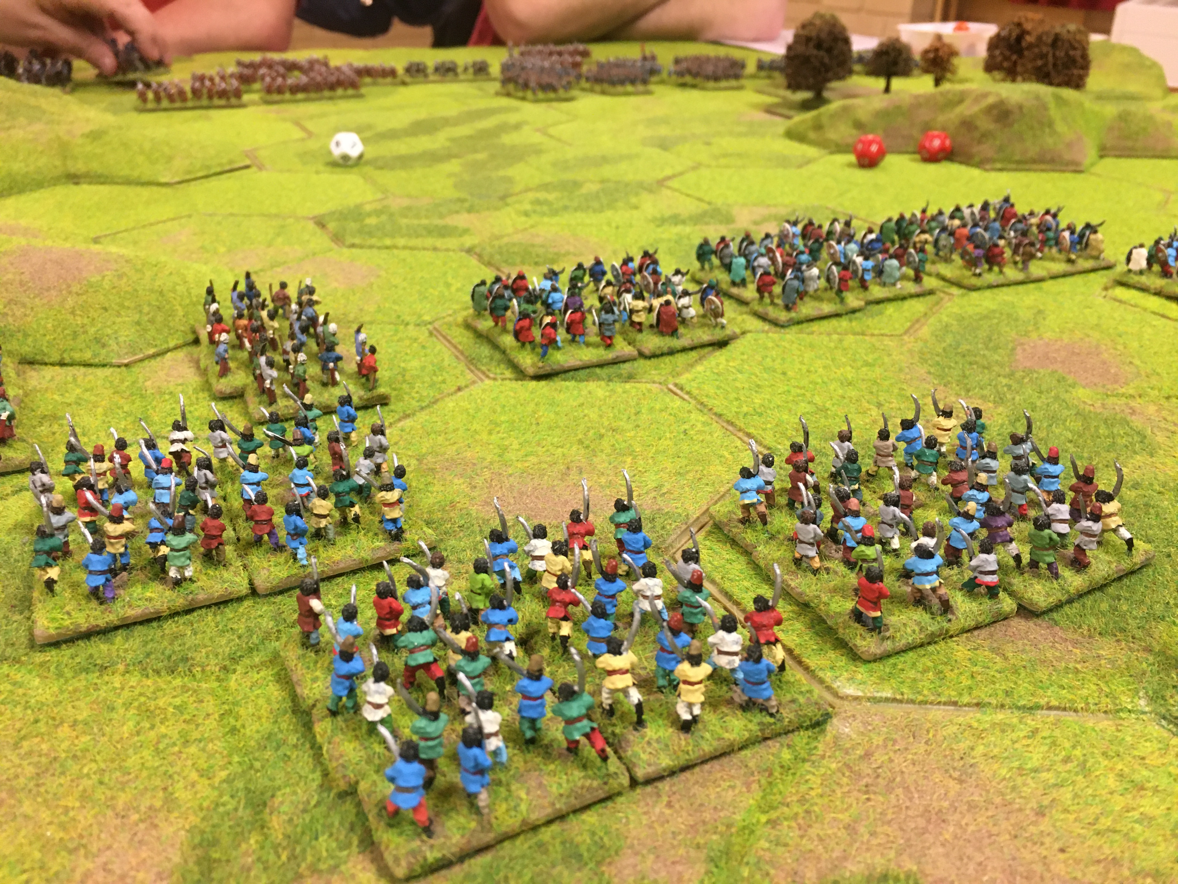 As the armies closed on each other, Tony’s Roman cavalry units quickly advanced through the single hex gap between the 8 hex escarpment and an area of woodland. This gave my Dacian cavalry the difficult choice of evading or standing their ground. With the assistance of a couple of Dacian hordes they decided to stand and fight. Meanwhile, James’s legionaries continued their slow advance in the centre while Chris’s Roman Auxillaries formed up along the ridge of the small escarpment and woodland.