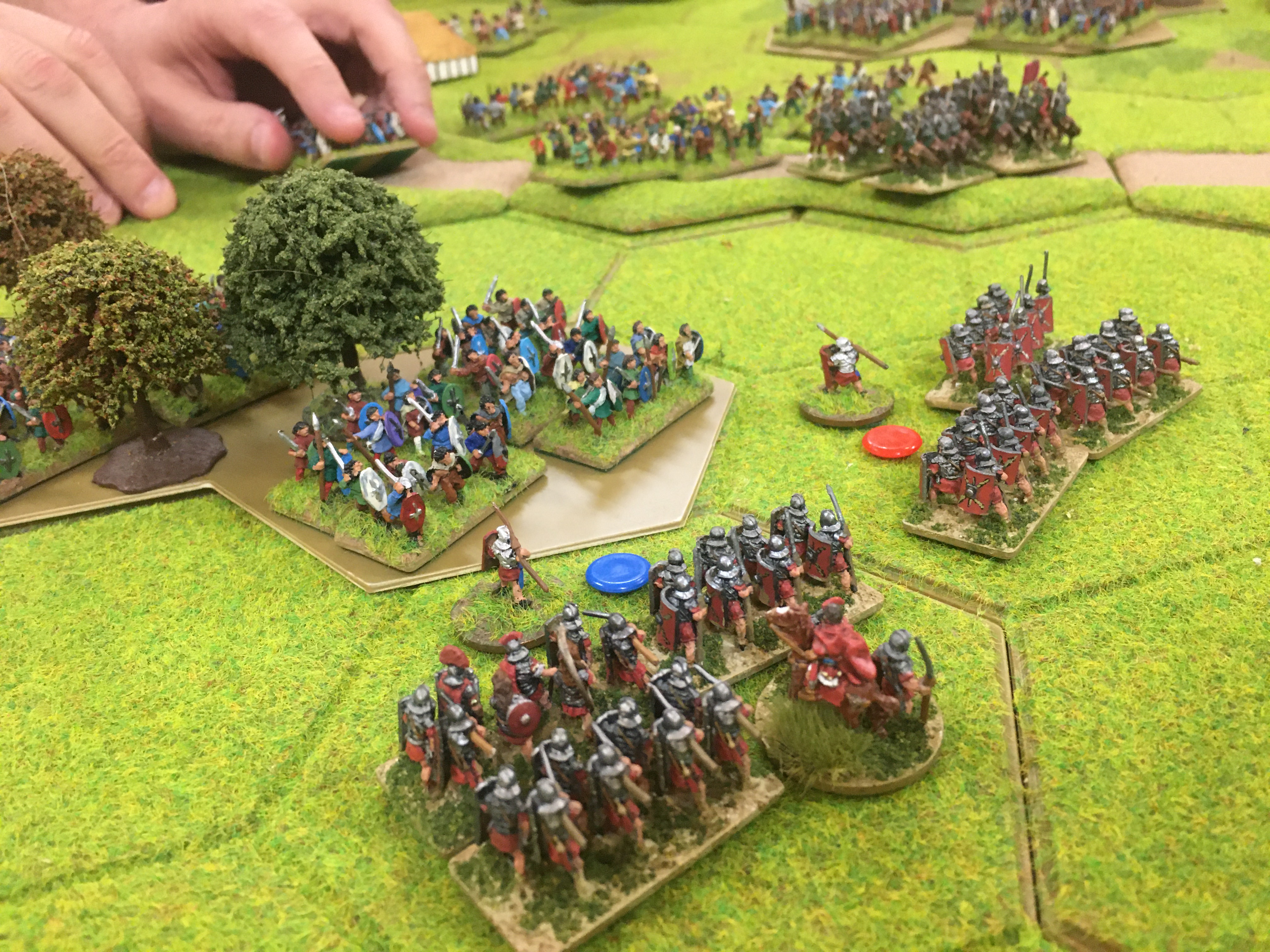Finally the Roman ballista units had moved into position to shoot, unfortunately their accuracy was poor and the Brits easily weathered the hail of badly aimed missiles. Tony and I moved our Roman line forward a hex only to receive more missile inflicted punishment. The legionary units were already beginning to accumulate in the casualty tray! I advanced the Roman archers and skirmish unit to engage the extreme right of the British line. They inflicted some damage on the British warriors only to charge and demolished in the next round of combat by other warriors. I had been holding back 2 units of Roman cavalry and 2 available generals as my last reserve, and this latest set-back inflicted by Chris’s warrior hordes left me with the difficult decision; to charge or not to charge!