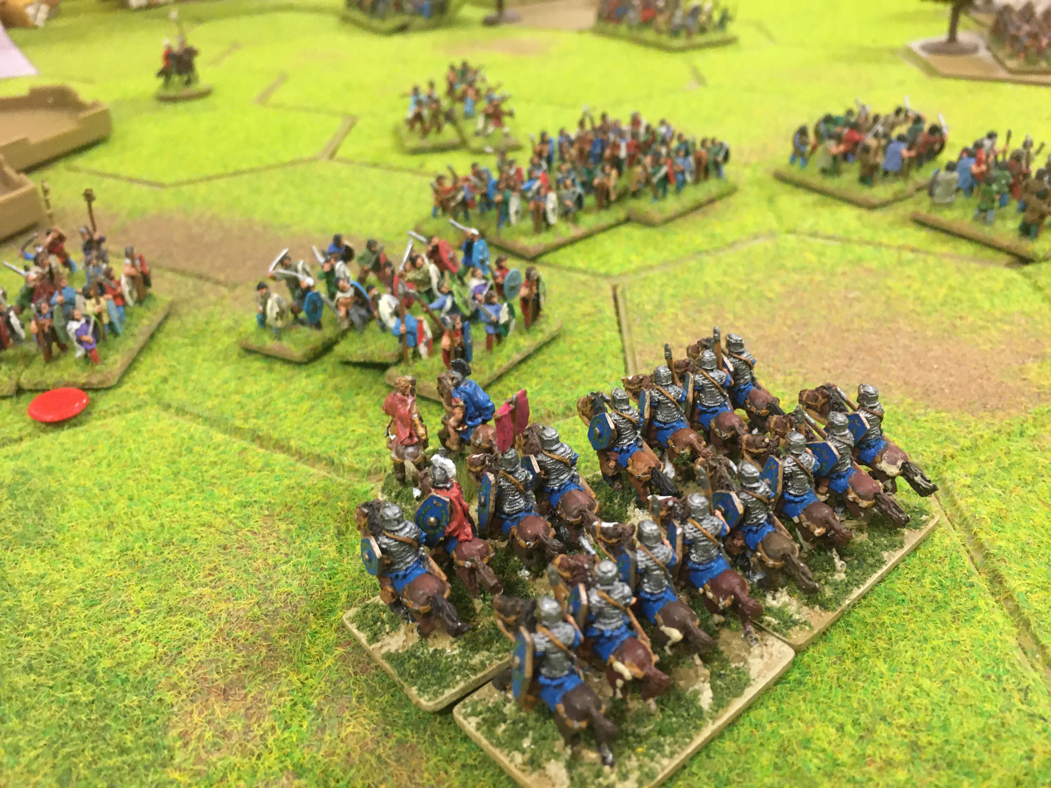 On my Roman left wing I was forced to throw caution to the wind and charged my 2 heavy cavalry units each accompanied by a general into the British warriors that had already dispatched my archers and auxiliary spears earlier. This time the hand-to-hand combat results went decidedly in my favour and the warriors were routed with my Roman cavalry in pursuit. On Tony’s Roman right wing, he and Tim had been taking chunks out of each other for close on 2 hours. The resulting attrition had diminished both sides to the point that neither side had the resources left to gain any meaningful territorial advantage