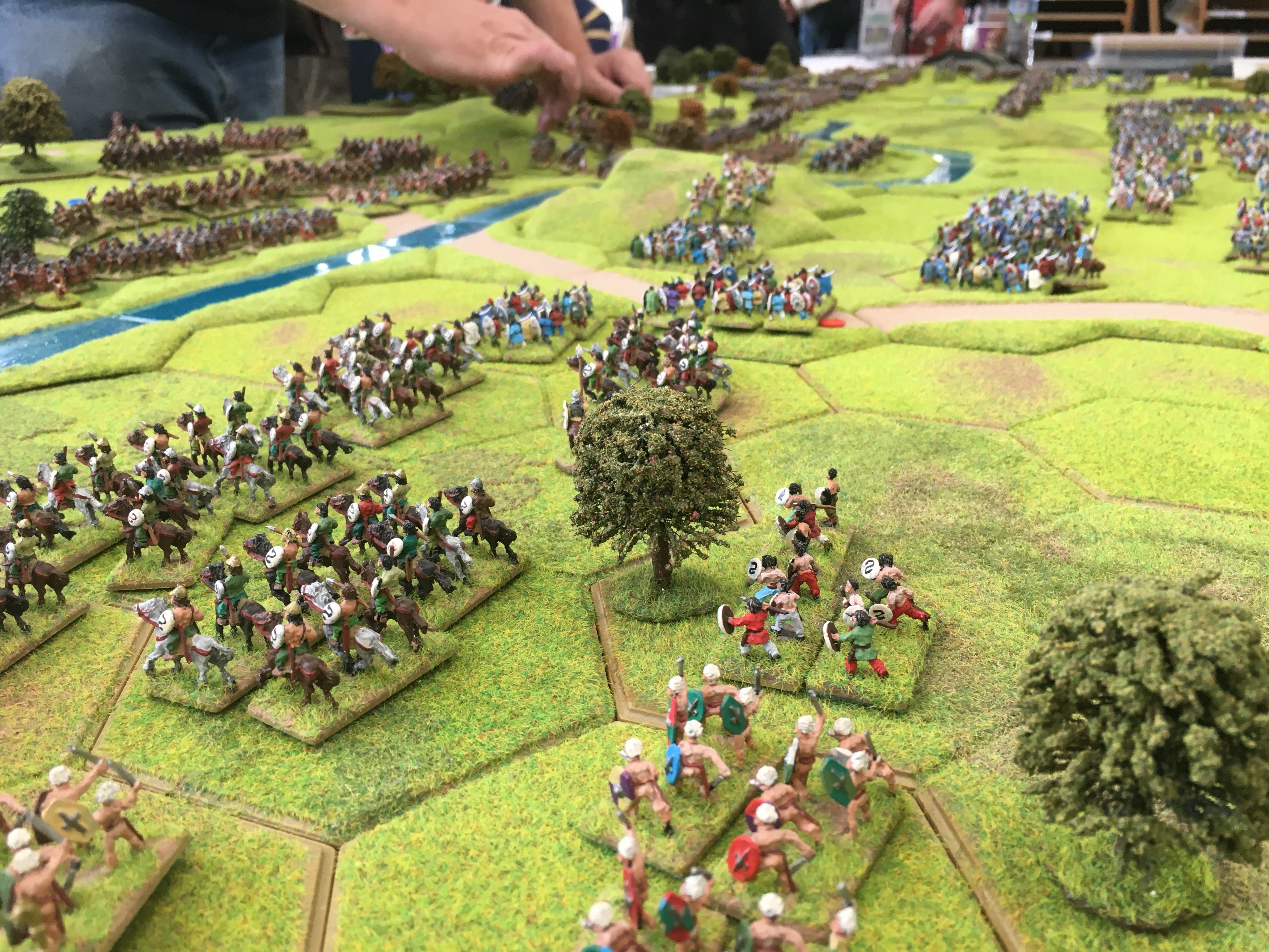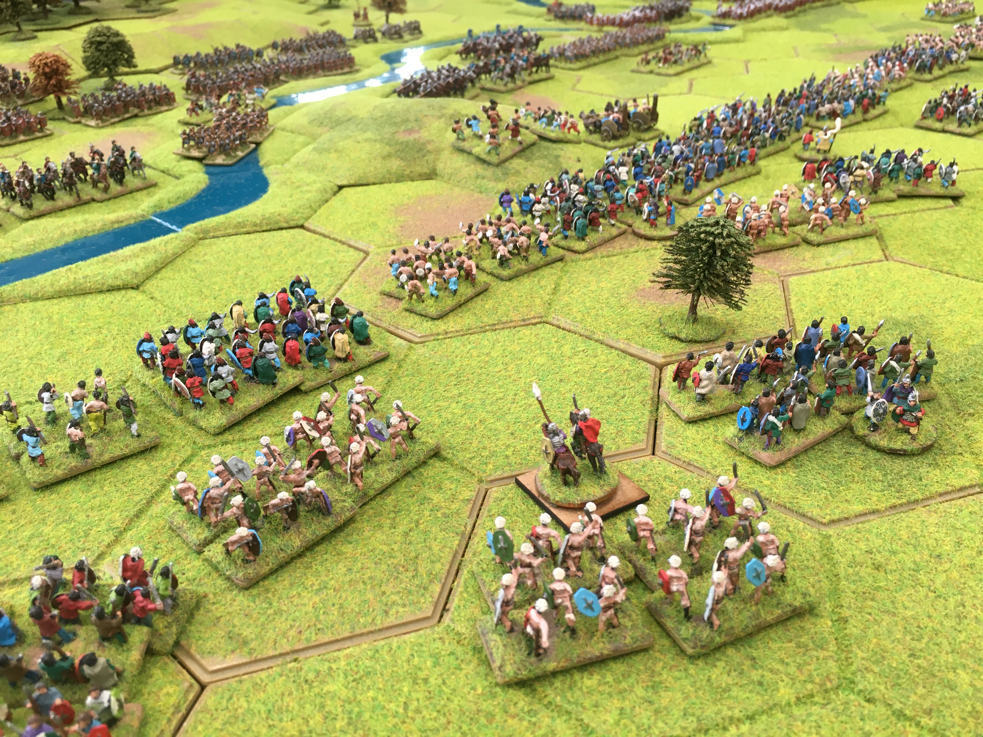 Roman cavalry and light cavalry units then crossed the extreme northern part of the river which forced the British to commit light cavalry units to the opposite end of the table. This was soon followed by the start of a general Roman advance to and across the river across the width of the board. By mid afternoon despite a number of local successes the battle of attrition was being decidedly won by the Romans. Gradually more and more legionary units established their lines along the west bank of the Medway.