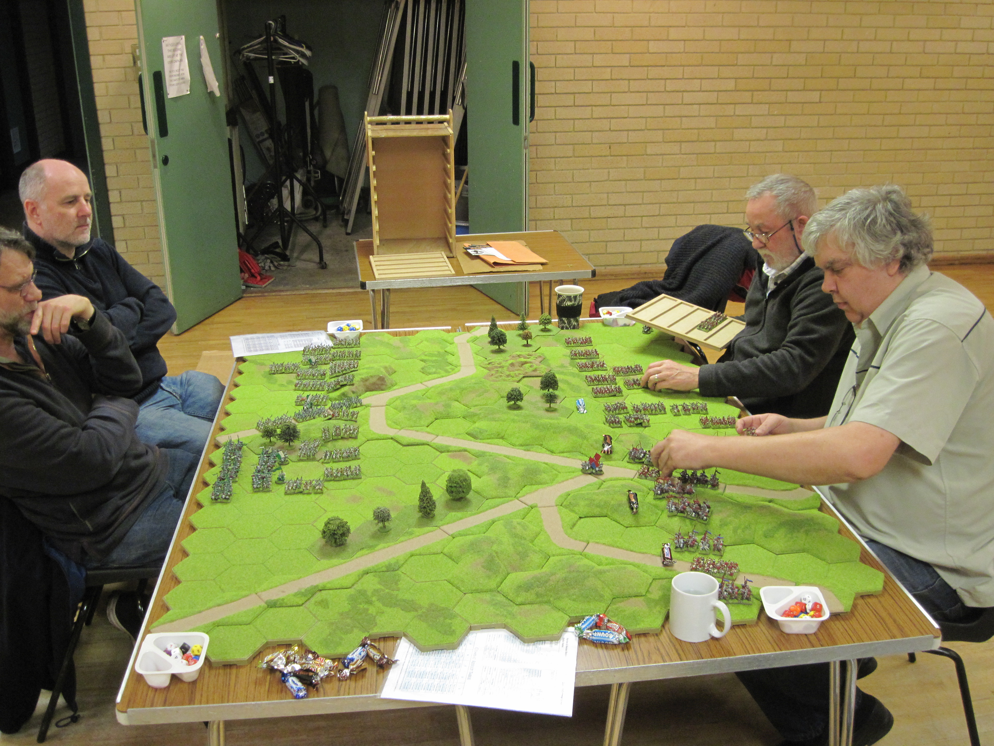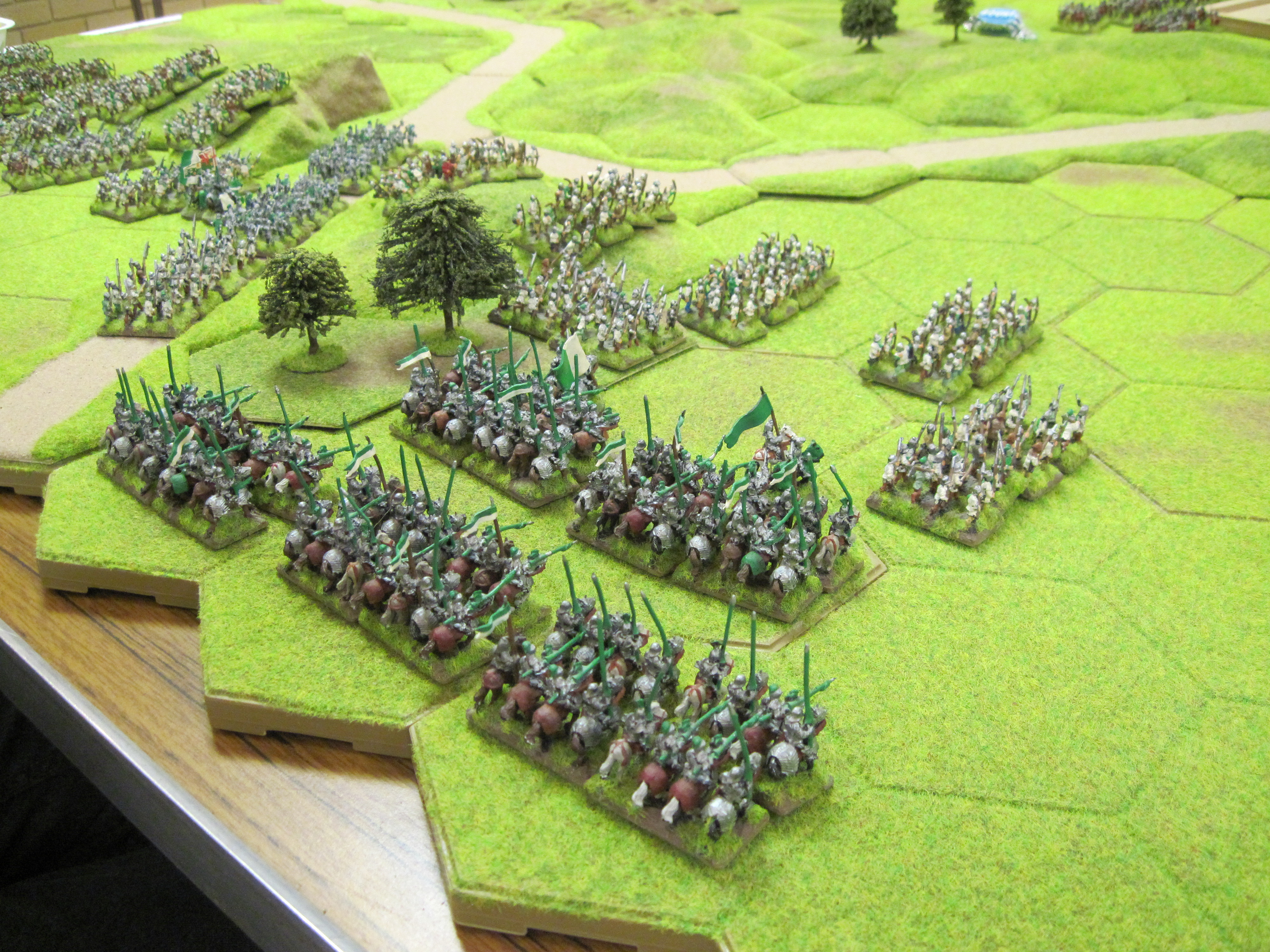 Andre chose and placed the terrain and we let the dice decide; who was on which side; army allocation; choice of table edge; first deployment and first move. This ‘dice-off’ resulted in Chris, Tim and I having the Tudors and Dave and Tony the Yorkists. The terrain layout, however, would prove to be the key element and Andre’s layout with central areas of woodland a 4 hex area of broken ground would dictate the position of the cavalry elements for both sides. There was little doubt that on balance the terrain favoured the Tudor army with its greater number of bill-armed infantry and useful cover from longbow shooting.