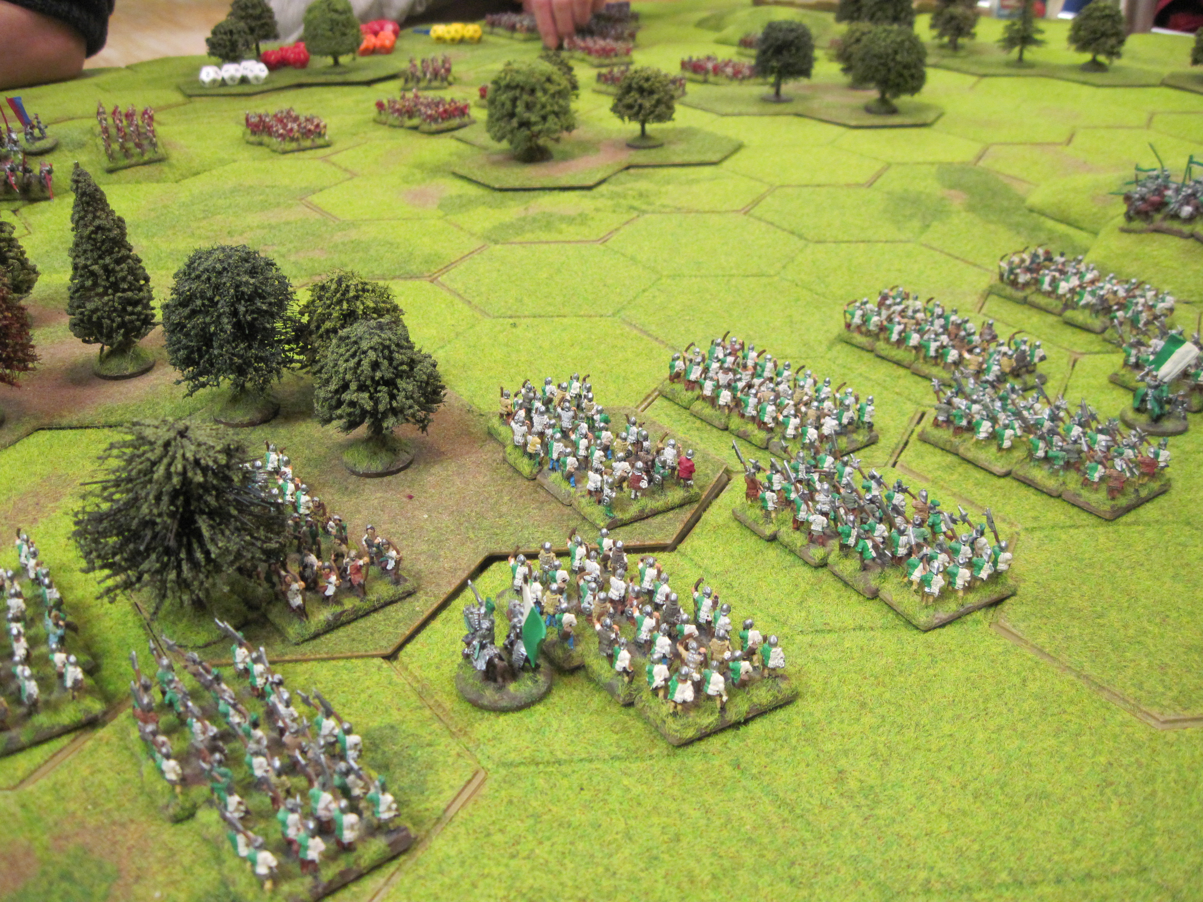 With identical armies, this was always going to be a game of tiny margins. Tony and Dave combined their infantry and cavalry in and between the central woods ready to attack Chris’s cavalry on our right wing. This would take time, and my infantry assault on the flank would have to proceed quickly to gain any advantage and in doing so disrupt their preparations. However, Dave’s longbow found their targets – 8 x 7+ out of 8x D12 shooting dice; that’s great shooting! As a result of very stubborn resistance from Dave’s infantry defending the woods, my progress was too slow, and Tony’s cavalry charged home against Chris’s cavalry waiting on and around a 4 hex hill.