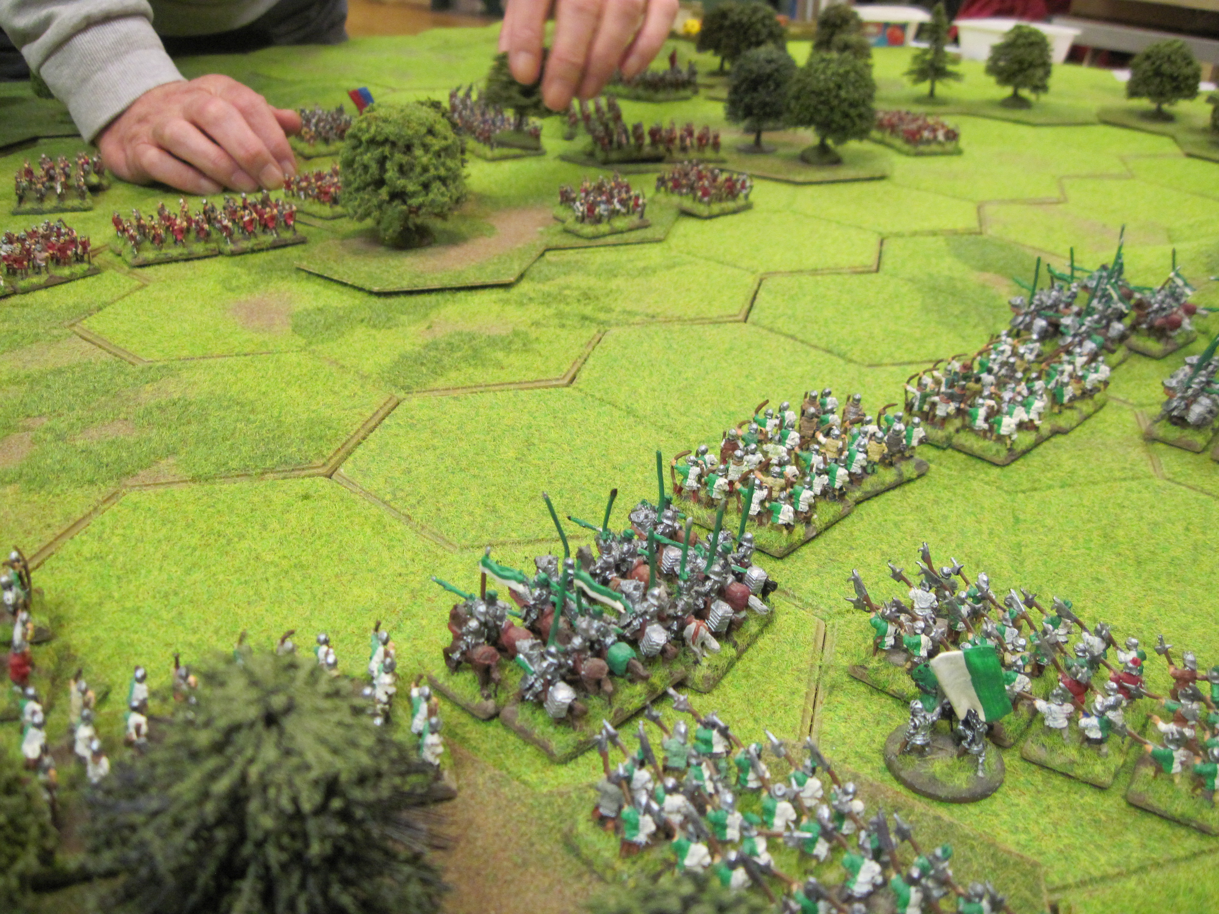After much head scratching, Chris and I decided to attack with our infantry which was concentrated on the left wing facing Tony’s cavalry. And, if and when Tony either removed or counter-attacked, battle would, at last, be joined. Tony chose to withdraw his cavalry behind the central wooded area which enabled us to swing our infantry attack towards the flank of Dave’s infantry defending the central woodland.