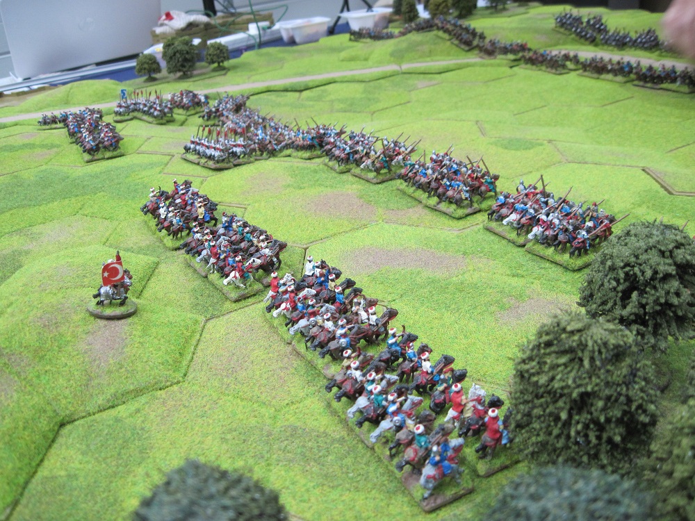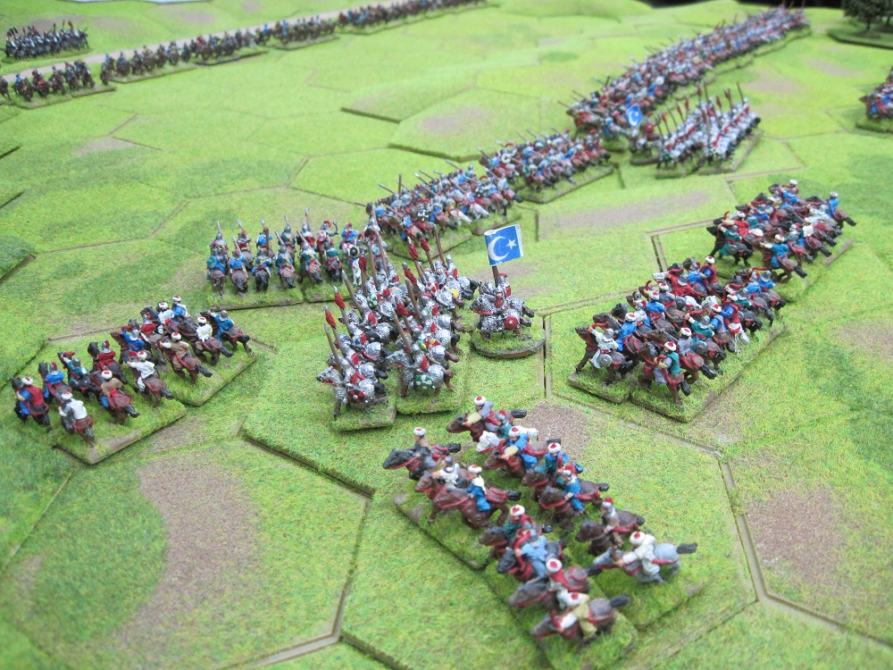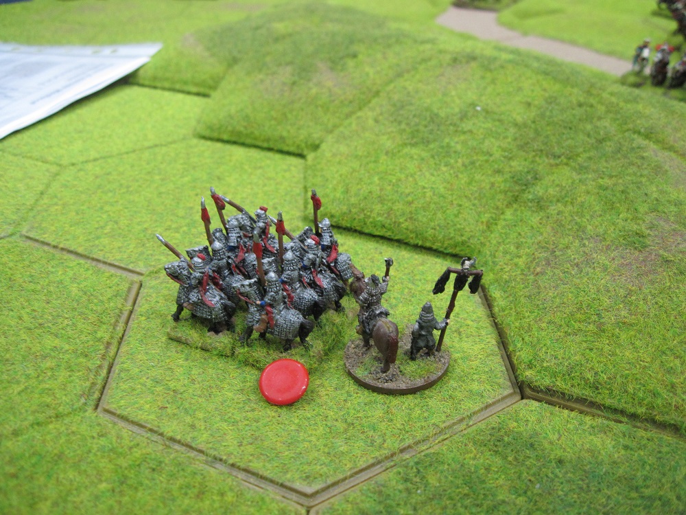 The first couple of tactical moves for both sides saw the small number of heavy cavalry units mostly accommodating a general, move positions within their own cavalry lines. The attack would come quickly, and the trick would be to make preparations in anticipation of this. Tony opened proceedings by pushing his Mongol light cavalry into shooting range of the extreme left wing of our line where 2 units of Akici cavalry were occupying a small area of woodland. Despite the extra A2 cover afforded by the wood hexes in the ensuing shooting phase managed to disrupt one unit and disrupt and recoil another.
