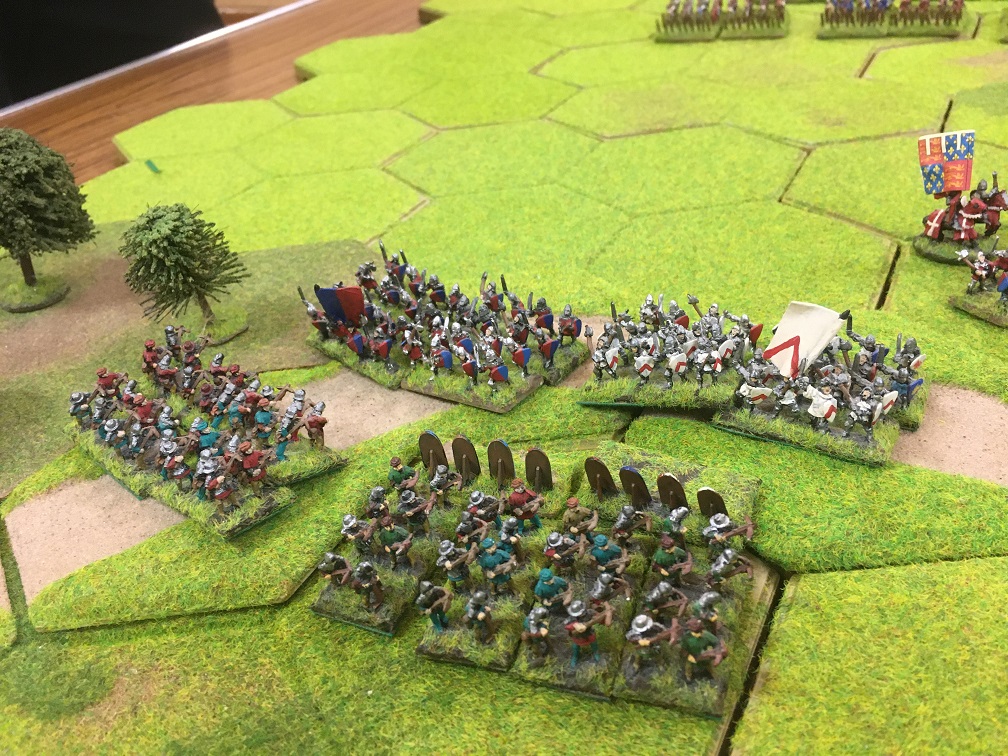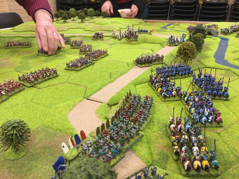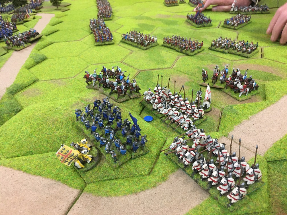 Chris was given the challenging task of racing to prevent Tim’s French crossing the bridge. He had 2 units of mounted men-at-arms (knights), 4 units of mounted sergeants and a general with which at maximum speed he managed to reach a small 3 hex hill overlooking the bridge but not block the bridge. As an aside, I remember thinking at this point that enlarging the game might just make the French mission somewhat easier!