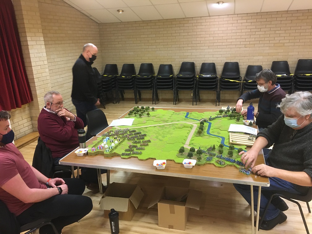 The first club game of 2022 was an enlarged version of the Skype Hundred Years War game which we played during the Christmas break. There were now 6 players and not 2 and so the playing area was extended from 6ft x 4ft to 8ft by 6ft, the English tented camp was enlarged and the distance from the English deployment zone to the bridge extended by 3 hexes. The size of both armies was also proportionately increased which gave the increased number of players more units to command along with the number of generals increased from 3 to 4 for both the English and French armies.