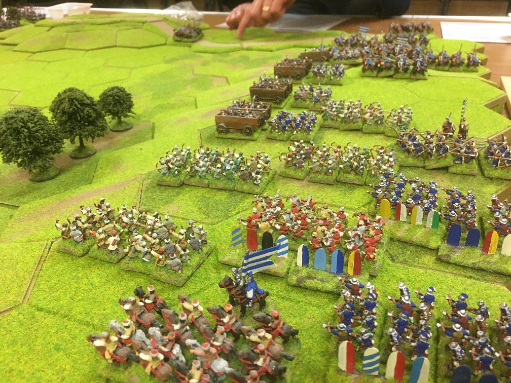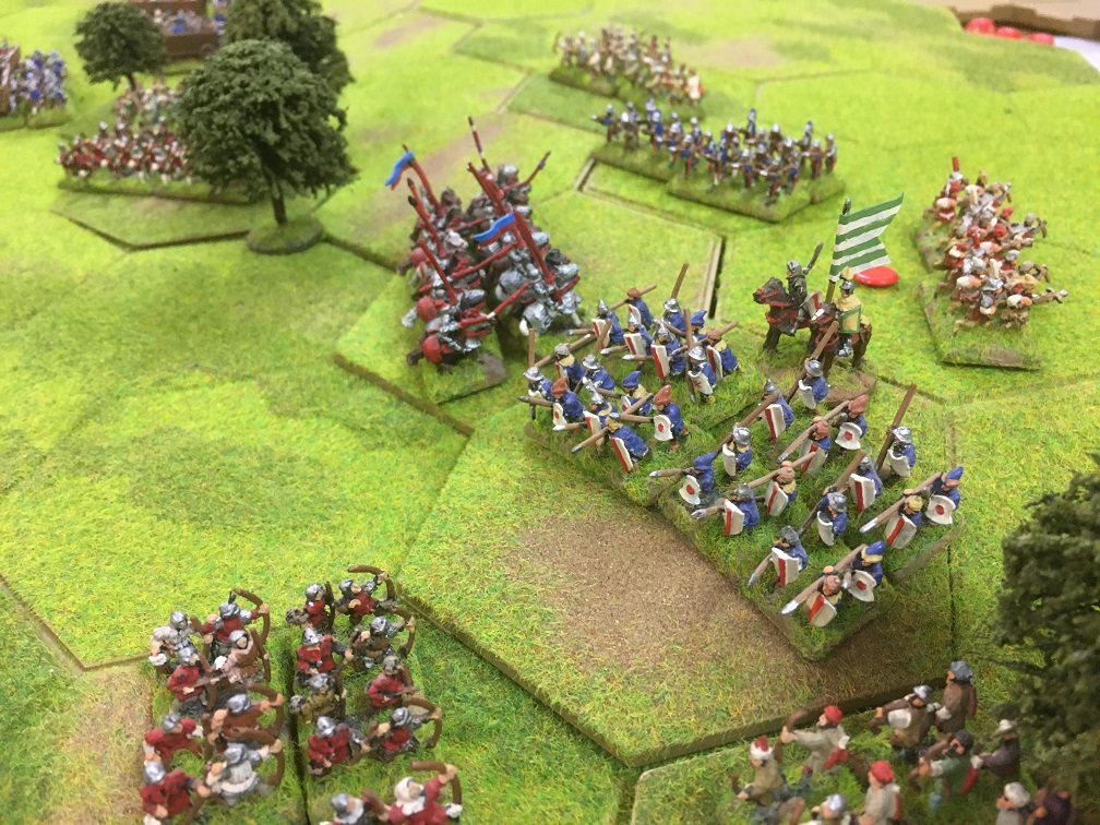 The victorious Yorkist cavalry gathered in the centre of the table to deliver another charge, this time, aimed at the Hungarian infantry line in the centre. The Yorkist longbow engaged the Hungarian crossbow units in a shooting match and the line started to buckle. It was no surprise that when the Yorkist cavalry finally charged home the Hungarian infantry line defending the slope was soon broken delivering a Yorkist victory.