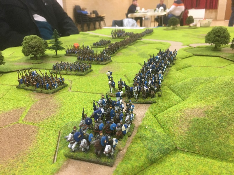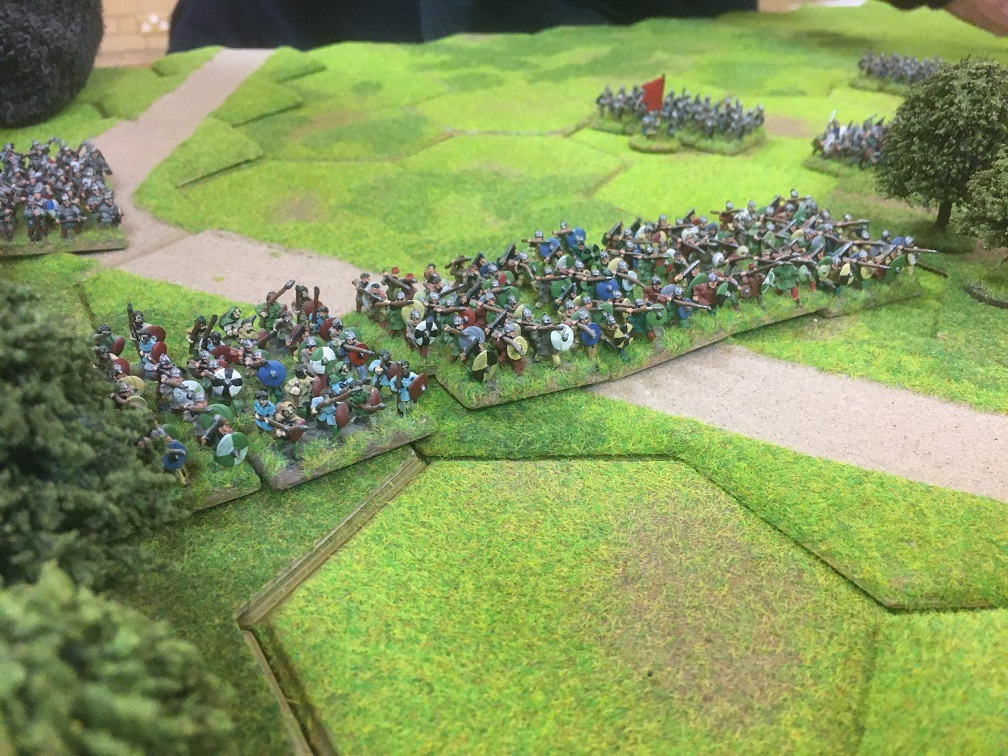 Opening moves saw Tony quickly advance his Saxon hordes to gain control of the 3 hex wood on the extreme right of his line. Tim moved his cavalry quickly on a flanking move against Dave’s select fyrd on the other wing. Chris concentrated his missile infantry supported by the ballista unit in the centre.