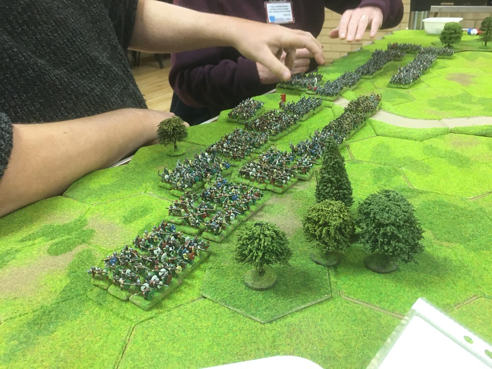 The Saxon v Romano British games are usually a close affair. The key differences between the armies are the greater mobility of the Brits with their use of cavalry and chariots and slightly stronger infantry hordes, whereas, in comparison, the Saxons have ‘A’ class housecarl units and more ‘B’ class select fyrd infantry. Because the Saxons only fought on foot their command range was 2 hexes compared to the Brits 3, but the reduced command cost enabled the Saxons to field an extra general along with 25 fighting units compared to the Brits 19. The total cost including a Hero General for each side was, in theory, 256 points!