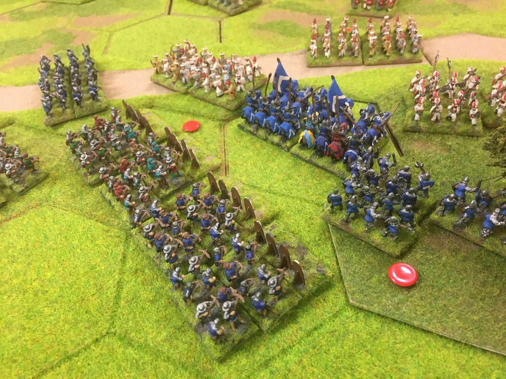 The choice of table edge fell to Tony, James and I, which gave us an opportunity to pick the side which gave the most cover for our French army. Dave and Tim (Ottomans), did quickly advance in their first move to occupy the open centre of the field but were confronted by small, French filled woods. Between these were stationed the French crossbow units behind a wall of pavisses. Quite a formidable barrier the Ottomans who also had the steep slope of the 8 hex escarpment facing their left flank. Because the steep slope was unscaleable with cavalry we positioned our weakest French units, 3 peasant hordes behind this obstacle.