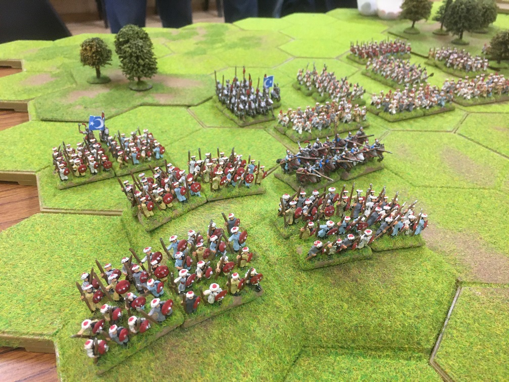 The terrain layout was already set before I arrived slightly late at the club and consisted of open ground punctuated by a large number of multi-hex areas of woodland. The most tactically significant of which was a spine of woodland 2 or 3 hexes wide which stretched almost from one table edge to the other with only a 2 hex wide area of open ground in the middle. The deployment zones of both armies were effectively divided in two which would hinder the ability of the wings of both opposing armies to support each other.
