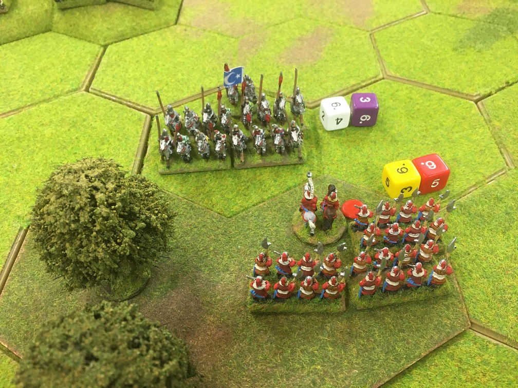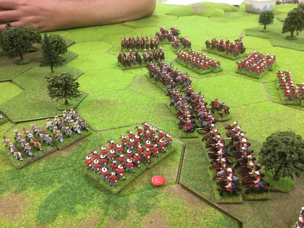 This lucky break bought Chris much needed time in which to take on and defeat some of Tim’s infantry including the Janissary units. This in turn cleared the way for the two Chinese heavy cavalry units to finally navigate the 2 hex gap between the woods and come to my aid. These heavy units had so far had a very easy game so far with there mounts having little to do but eat grass! Tim’s Janissaries were eventually defeated in the woods but his Ottoman spear units and Azab archers accompanied by two generals were still ready and waiting to take on the Chinese cavalry.