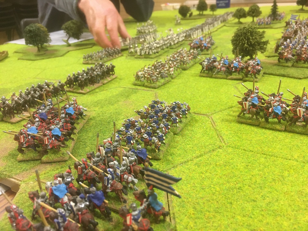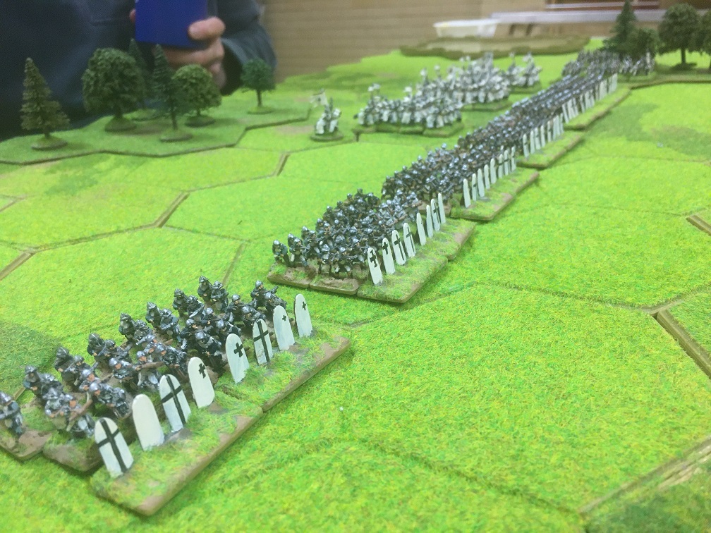 The epic cavalry engagement went in favour of the Hungarians, really because the good shooting of the stubborn Hungarian infantry enabled the Hungarian cavalry to get the mass charge into the centre of the Teutonic army. And, at this point of the game the Teutonic knights where already split into 2 separate groups of heavy cavalry and therefore unable to act as one body.