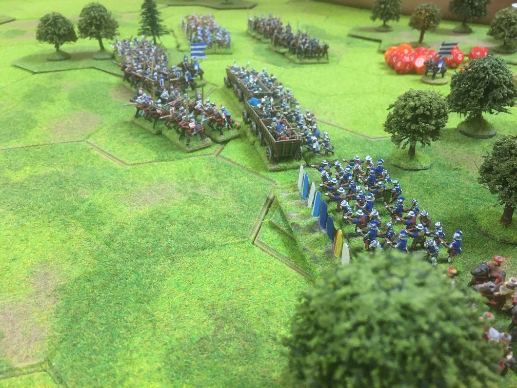 Opening moves saw the Teutonic crossbow units establish an extended line in the centre with the spear units on either flank and heavy knights and mounted crossbows behind. In response, the Hungarians quickly occupied 2 areas of woodland in which they placed their weaker ‘C’ class infantry. Between they deployed their two units of war wagons and crossbow units with pavisses. Again, the heavy cavalry awaited their opportunity behind the centre and left flank.