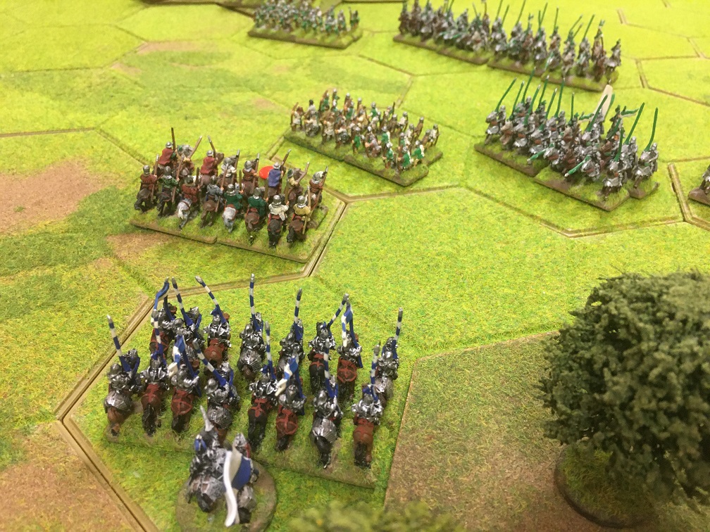 On the other flank Tony advanced 4 units of Tudor heavy cavalry plus 2 units of infantry emerging from the 4 hex wood against my extreme right flank. In response I sent forward the hobilars to hopefully buy me sufficient time to get my heavy cavalry ready to receive the anticipated cavalry charge. Remarkably, the hobilars where disrupted but held their ground against a unit of Tudor longbow.