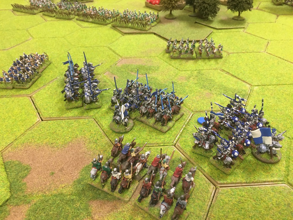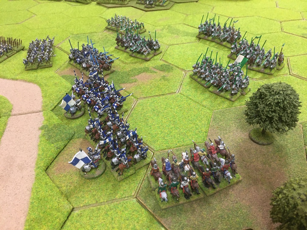 This was a classic War of The Roses encounter between 2 retinue armies of ‘B’ class professionals! The terrain was pretty open with an 8 hex hill towards the Yorkist table edge and a road to enable swift movement of units from flank to flank. Towards the Tudor table edge was a useful 4 hex wood and along one side of the open centre was a large area of woodland. The Tudor army army had 6 units of heavy cavalry and equal numbers of bill and longbow units. The Yorkist army had 4 units of heavy cavalry plus a unit of ‘D’ class hobilars, but also 2 extra units of dismounted men-at-arms which could prove very useful in the woodland areas. The longbow units of both sides had all been equipped with stakes.