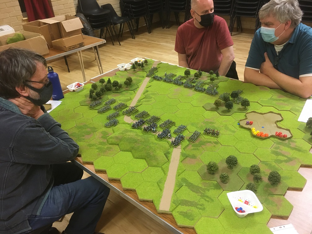 Tim and I had the Yorkists (blues), and Chris and Tony the Tudors (green and white), and our Yorkists got the first move. We reluctantly moved away from our 8 hex hill and set up our longbow shooting line behind our planted stakes just 1 hex in front of the road, the possession of which proved to be an important asset. Tony and Chris echoed our deployment using the 4 hex wood as a bastion protecting their left flank.