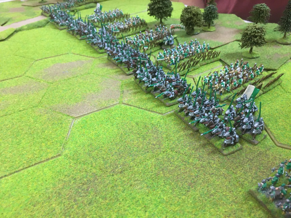 With an hour or so left we quickly set up the armies for another game with exactly the same armies and terrain layout. Tim and I decided that we would attack on both wings – infantry into the woodland on the left and heavy cavalry and 3 units of infantry on the right towards the other 4 hex woodland on the right. Again the longbow units of both armies faced off against each other behind a line of stakes in the centre.