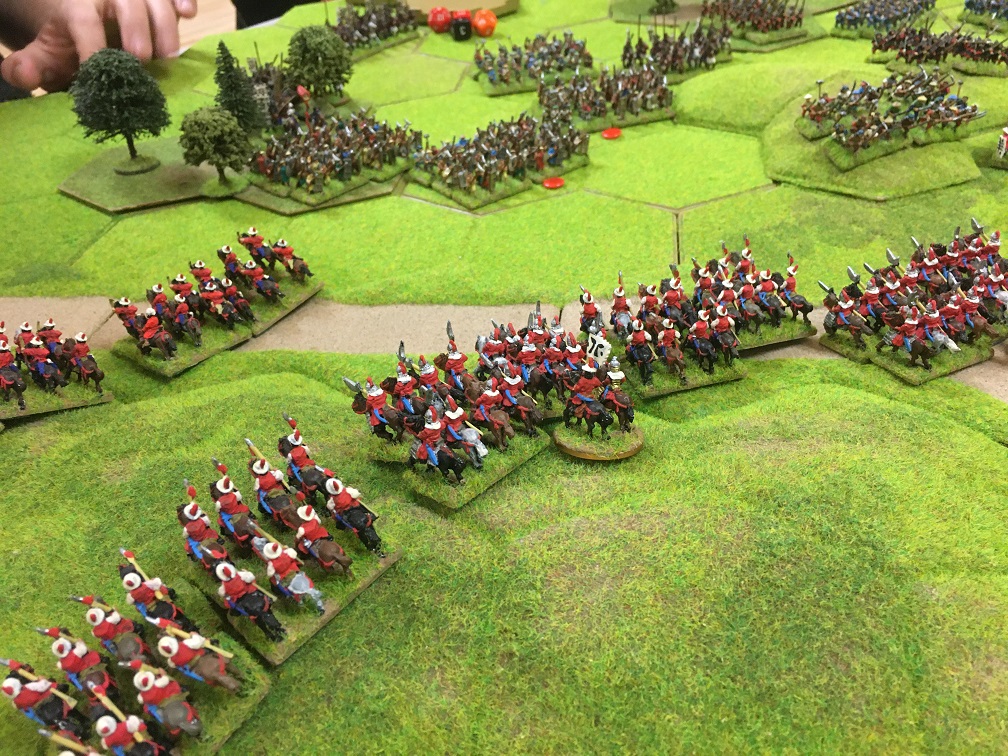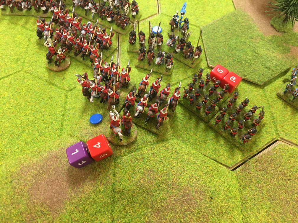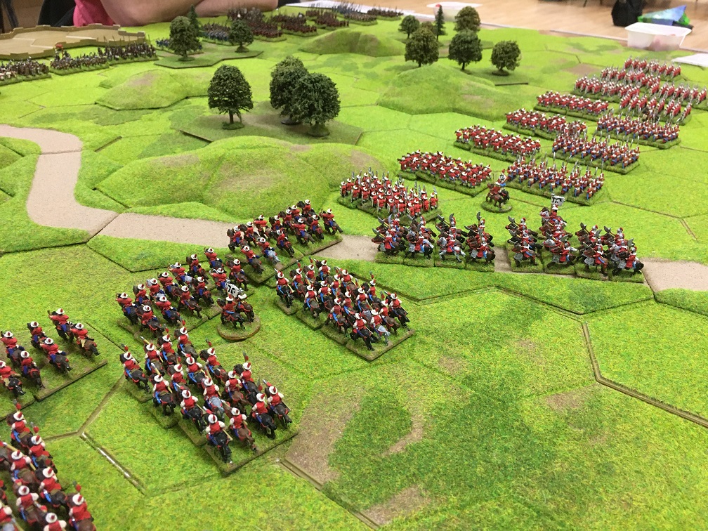 Sometimes, when you need just a little bit of luck, you unfortunately get none at all. The medium cavalry failed to hammer the peasants and the heavy cavalry fell at the first hurdle! As a result of this miserable combat performance Tony’s counter-attack proved devastating with the loss of the 2 Chinese generals and 3 units of cavalry. James’s infantry fought on valiantly but there was no way of reversing this disaster. It did take a while for the Chinese infantry to be finally defeated with James using the woods and escarpment to good effect, but I had already lost the game for us with my cavalry committing what turned out to be a suicidal charge.