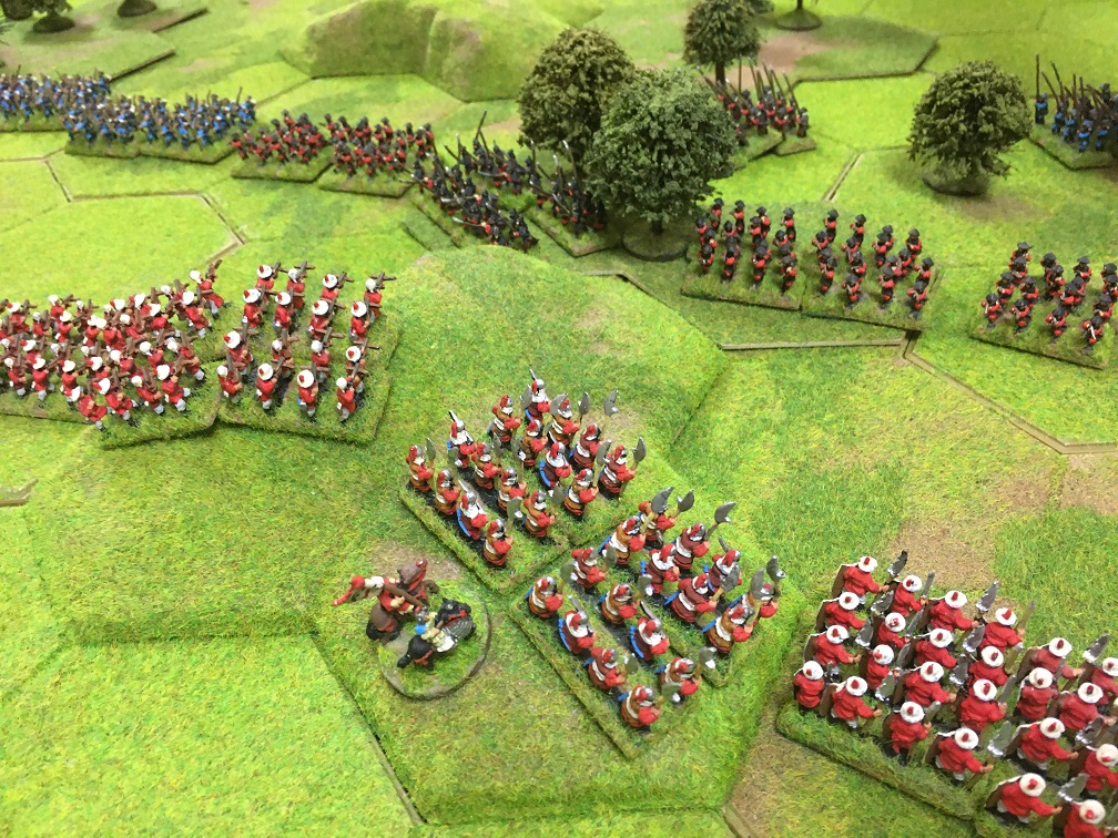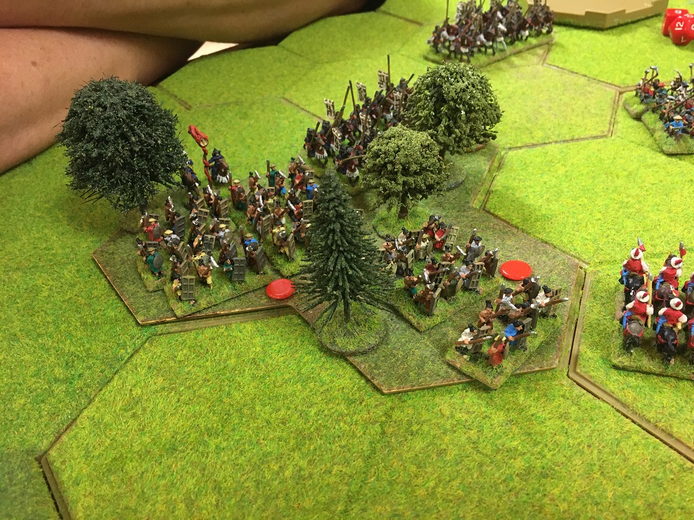 This club game was always going to be a brain teaser in that the terrain layout which was chosen before the armies were allocated to the players was always going to dictate the course of the game. The scattering of 3 and 4 hex areas of woodland and the rolling landscape created by the numerous hills and escarpments was not going to enable the two lines armies to face-off against each other in the centre. The dice dictated the Tony and Chris took the Samurai and James and I the Chinese and the dice then gave the Samurai choice of table edge, second deployment and first move – the omens were not good right from the start.