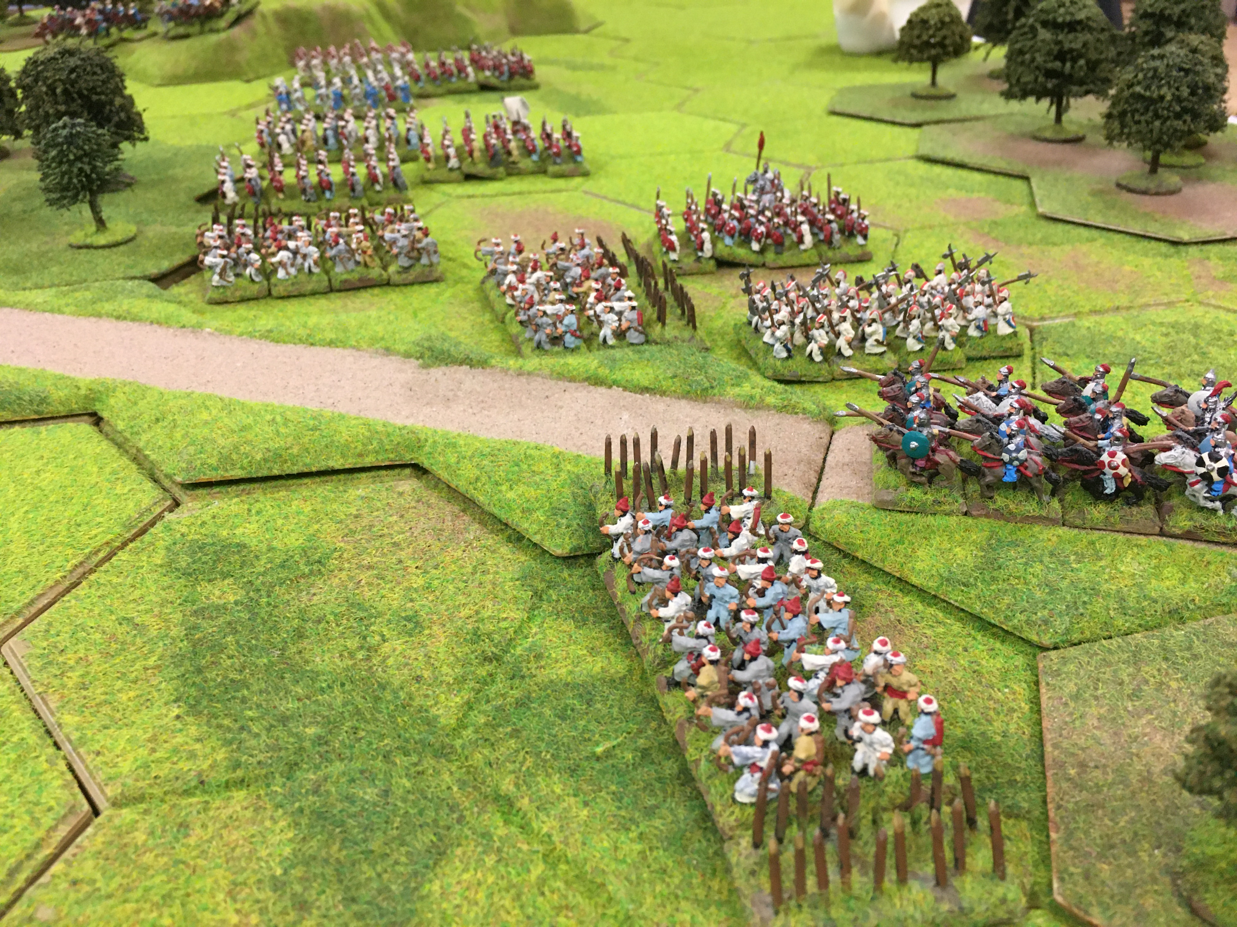 My Hungarian army moved first and in anticipation of a swift attack by the Ottoman light cavalry I quickly established a shooting line a third of the way across the table from my table edge. Tony in response split his cavalry; one heavy and two medium to the left and the three light Akincis to the right. The Ottoman infantry moved to a central 4 hex wood adjacent to the road and stopped.