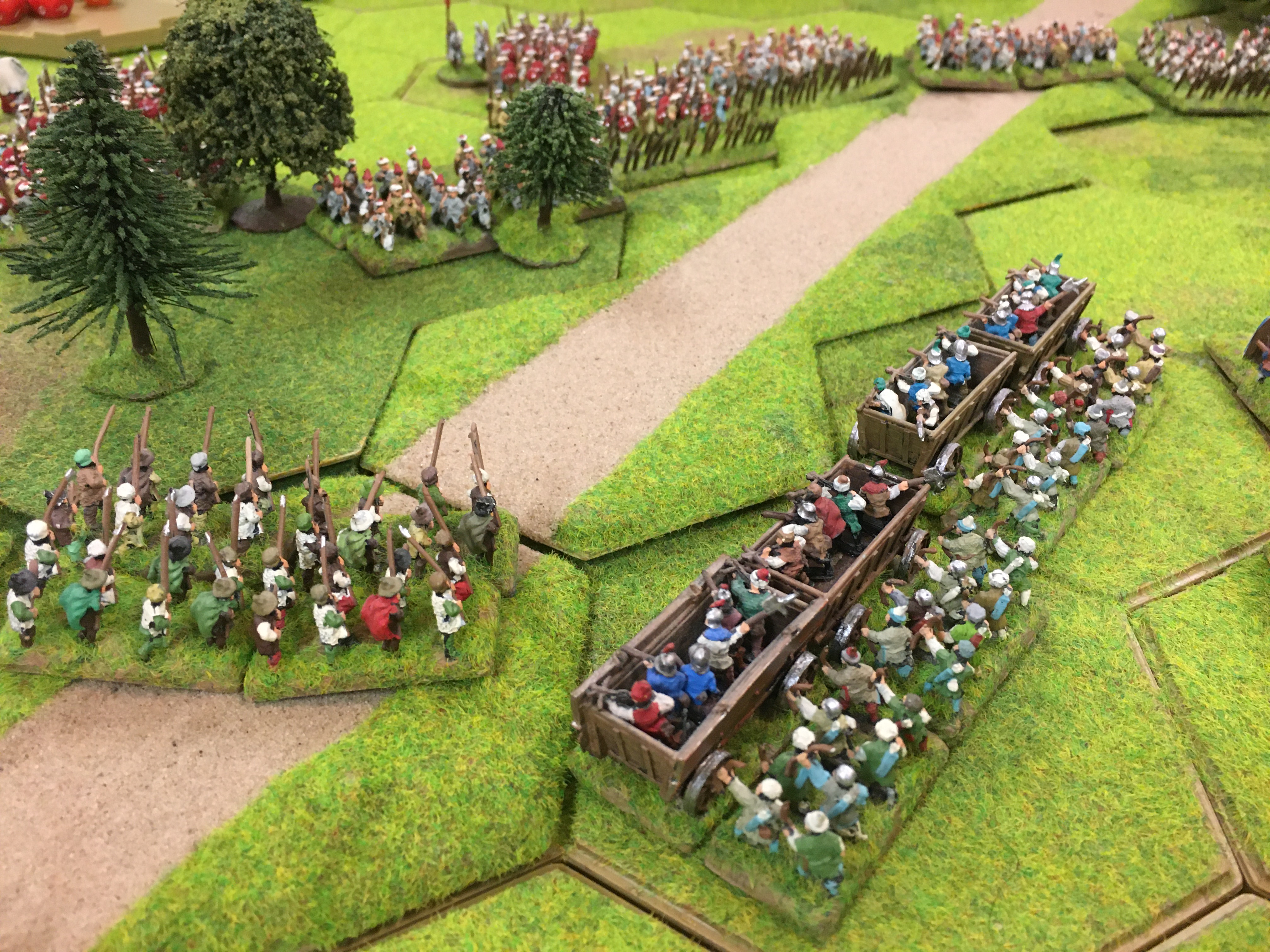 The terrain layout saw a scattering of 4 and 3 hex areas of woodland with a road snaking across the battlefield linking the deployed armies. There was a limited amount of high ground in the form of a couple of small 4 hex hills towards the table edges.