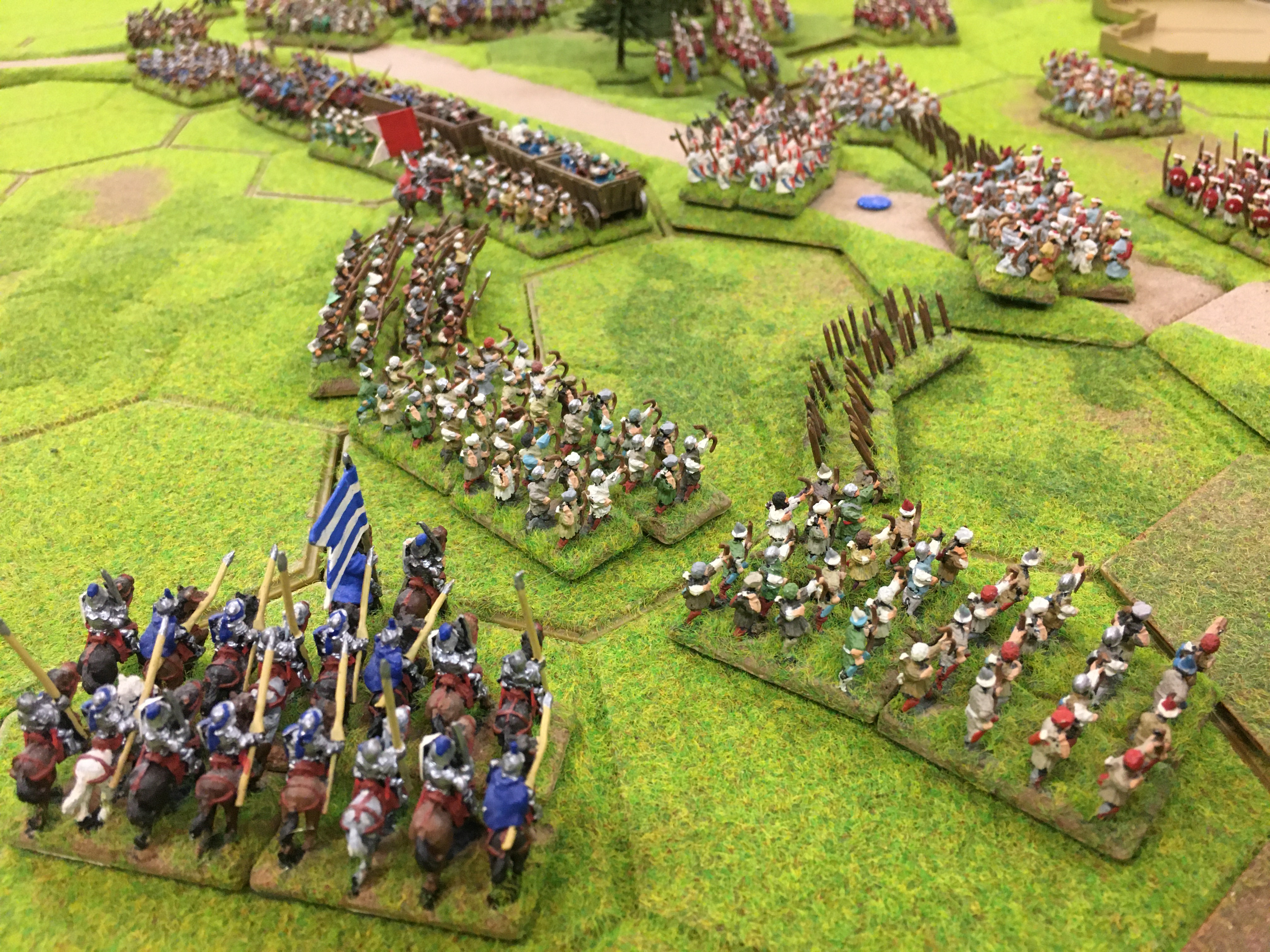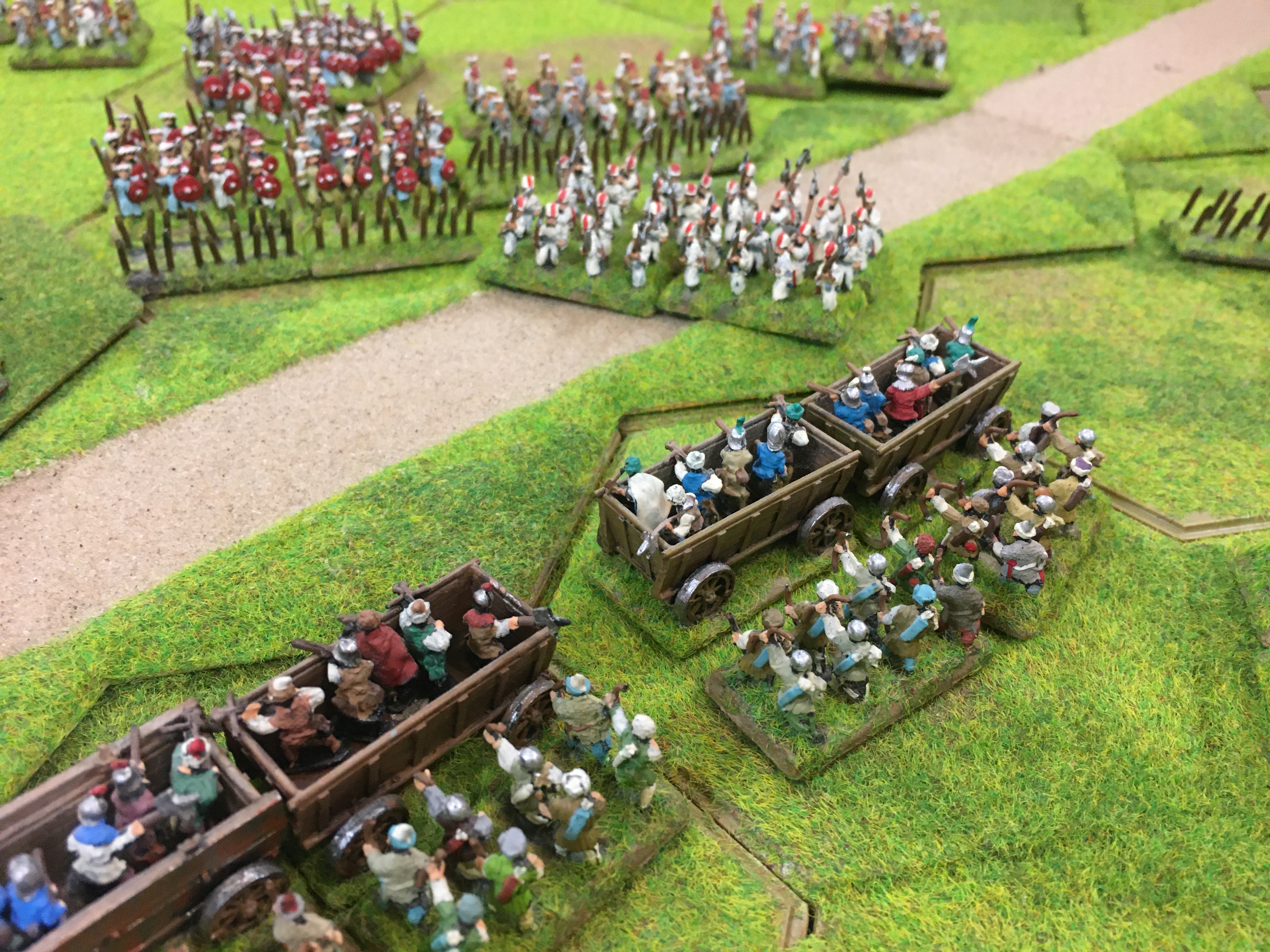 An overview of the game at this point showed a pretty even confrontation in the centre, with the war wagons providing a vital bastion to the now very thin Hungarian line. The Ottoman heavy and medium cavalry defeated on the Hungarian right and their archers and heavy cavalry were beginning to sweep around behind the Ottoman centre. However, the reverse was happening on the other wing as the all conquering Ottoman cavalry, which had probably by this stage accounted for at least 75% of the Hungarian casualties, mostly peasants, were able to outflank the much slower Hungarian infantry. The whole battle was beginning to look like a giant wheel with the war wagons providing the hub. I think we accepted that neither side had after 2 hours of play gained a tangible advantage over the other so we agreed a draw!