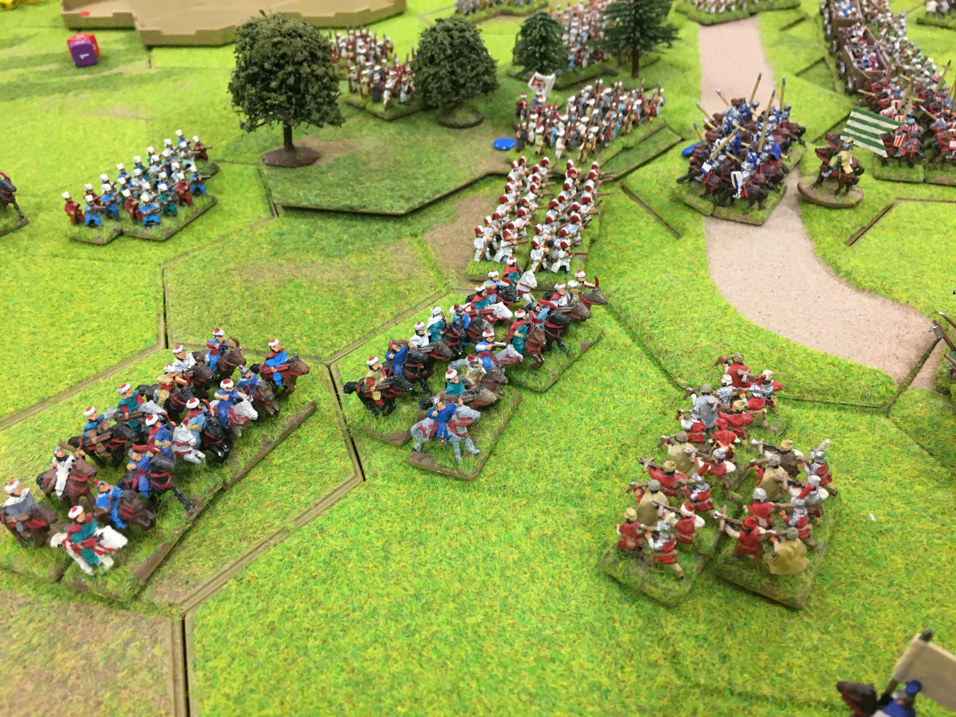 I sent 4 of my peasant hordes at their blistering pace of one hex into and behind a 3 hex wood to create a bastion on my left flank to try and stop the Ottoman light cavalry from getting behind my left flank and rear. This turned into a chicken shoot as Tony prosseded to pick off my peasants sheltering from the Ottoman bows at a rather alarming rate!