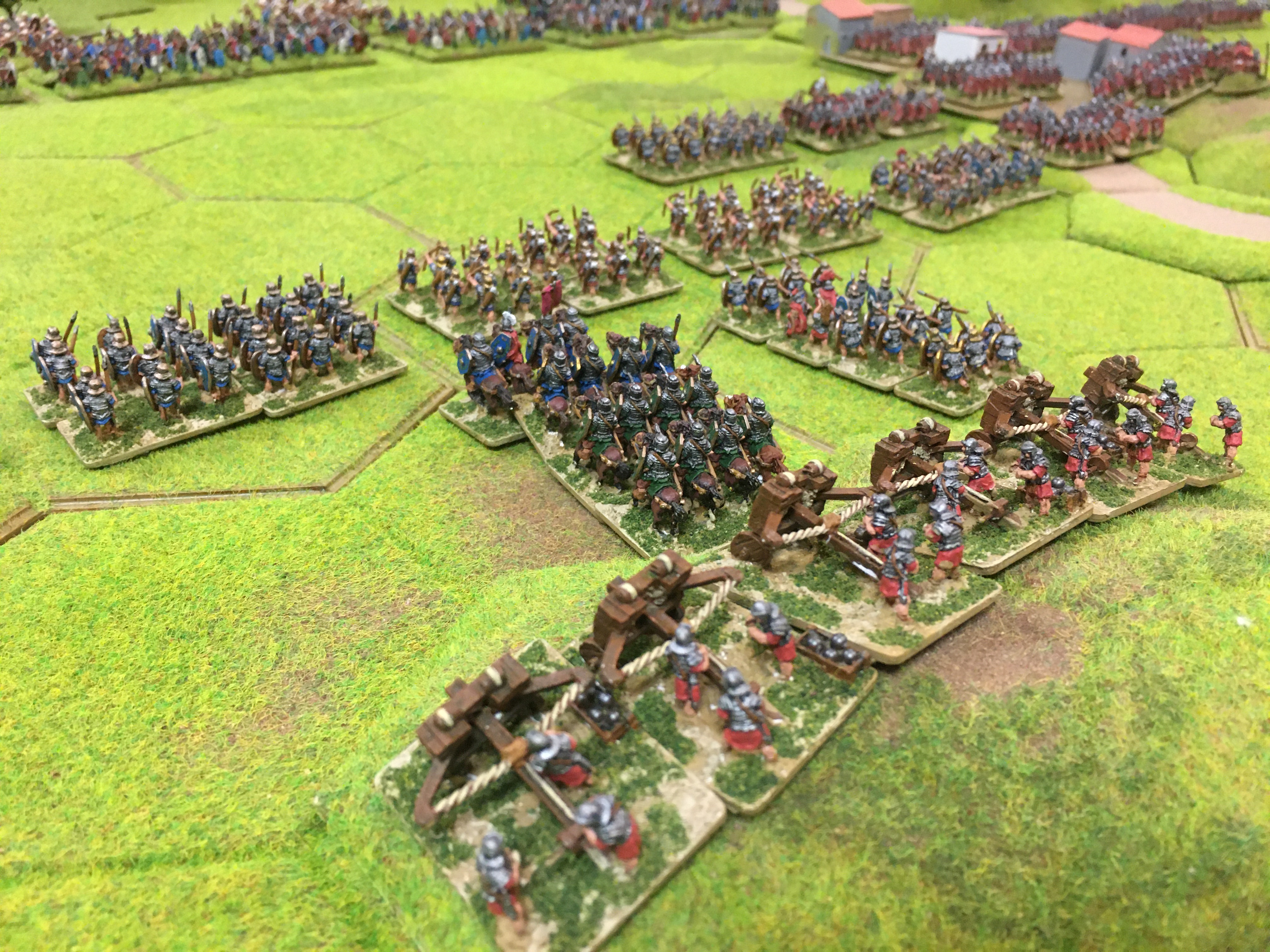 We deployed all our Roman legionary units inside Reading and directly to the left and right of the settlement stretching all the way to the table edge on the right. Their front protected to by a 4 hex escarpment on the right and an area of woodland straddling the road leading into the settlement. To the left was the wide expanse of open ground punctuated in the centre by a 4 hex hill on which we deployed the 2 units of ballista with the 3 units of Auxiliary archers in front. The Brits deployed along the trade route across the whole width of the table with the chariots and skirmishers on their right and the slingers and light cavalry on the far left facing the Roman legionaries in Reading and Behind the 4 hex escarpment. The mass of the British warrior hordes and fanatics were located in the centre of their deployment zone.