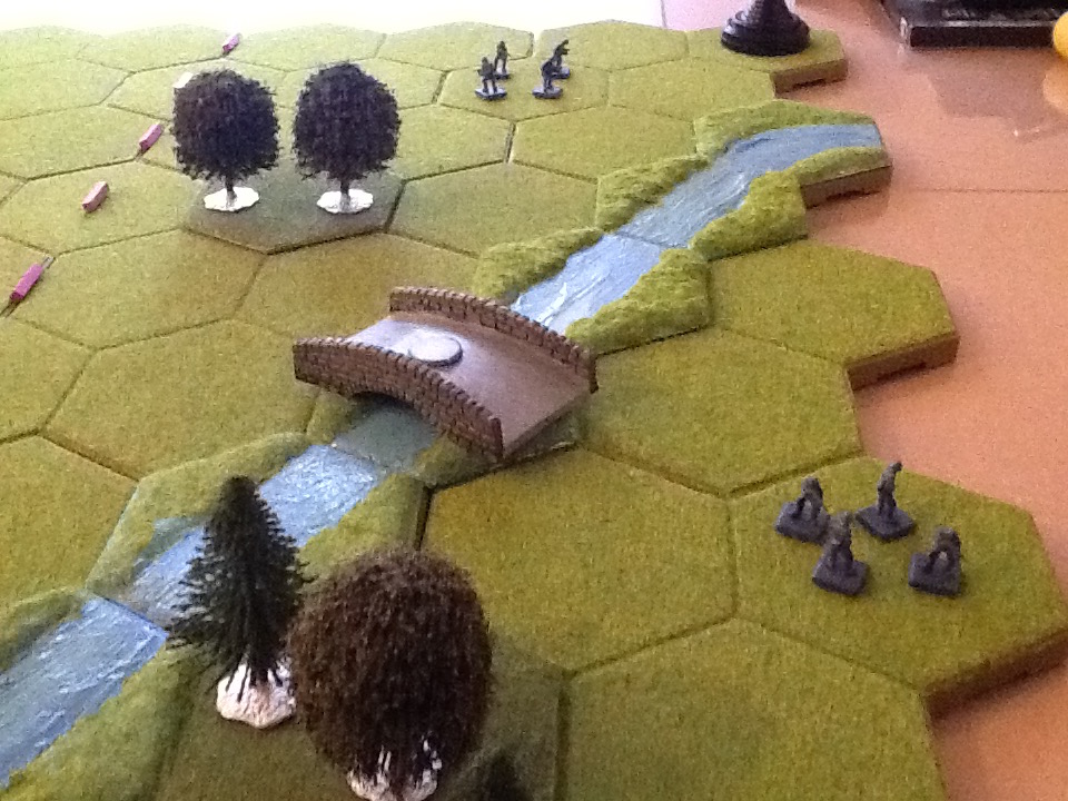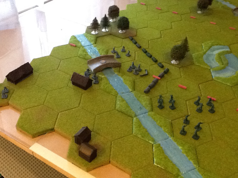 I have set up the first Memoir 44 board game scenario using Kallistra called "Pegasus Bridge" for a game. [The scenario uses Green American playing pieces to represent the airborne troops.]