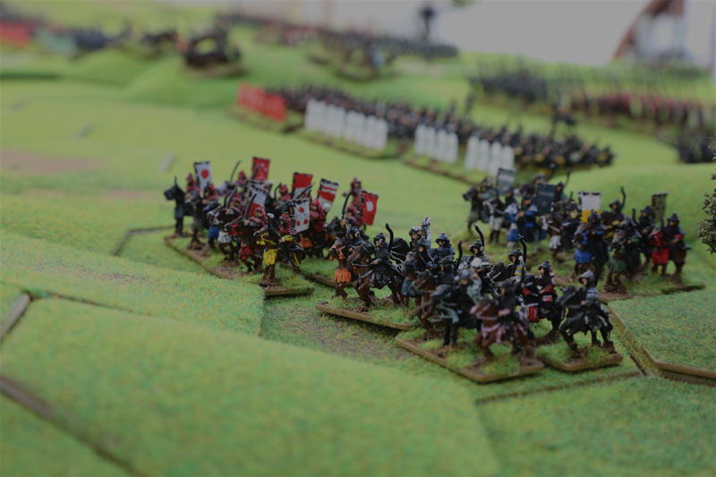 Danes left wing had three lines of troops; missile troops with pavisses, then 3 units of mounted samurai and finally a back line of 4 units of ashigaru with yari. Against these I charged three units of mounted samurai, one foot samurai and a unit of ashigaru archers with other units following in support. At this stage of the battle it was an ‘all or nothing’ attack with no point of holding back so I committed both the ‘blue’ generals into the front line hand-to-hand combat. Thankfully, 4 missile units failed to stop the charge and they were smashed resulting in a cavalry v cavalry confrontation, which, with the help of the two generals was won by the blues. This only left the line of ashigaru between my cavalry and the cannon. The carnage on this side of the field had turned the tide of the battle in my favour. I had lost 10 units, more than 40% of my army, but Dane had now lost slightly over 50% due to the collapse of his left wing and a win, if only a marginal one to my side. However, a quick scan of the battle field showed that Dane could claim a victory on his right wing although his centre and his ‘bl---y’ guns would soon fall to the onslaught of my samurai cavalry.