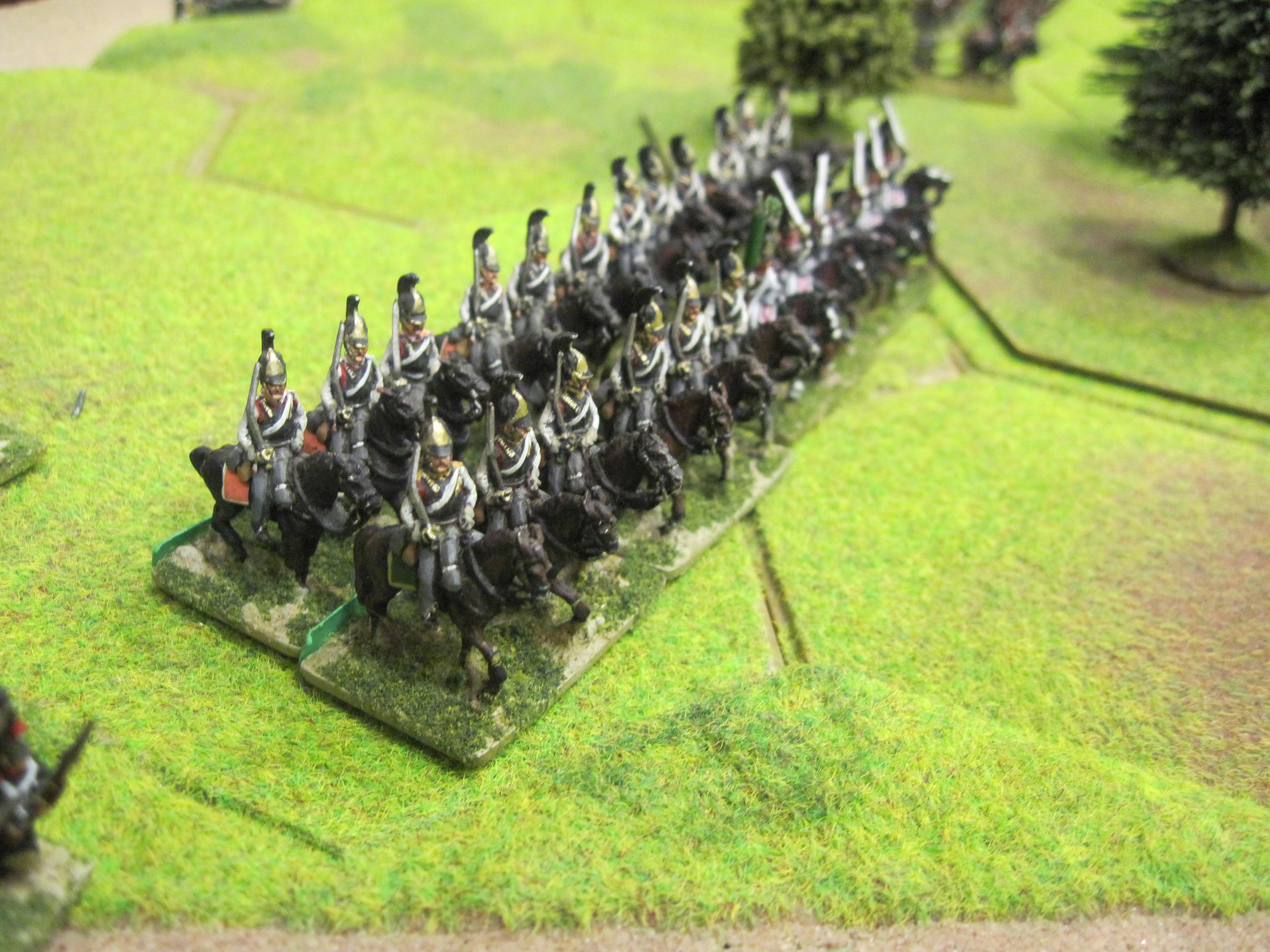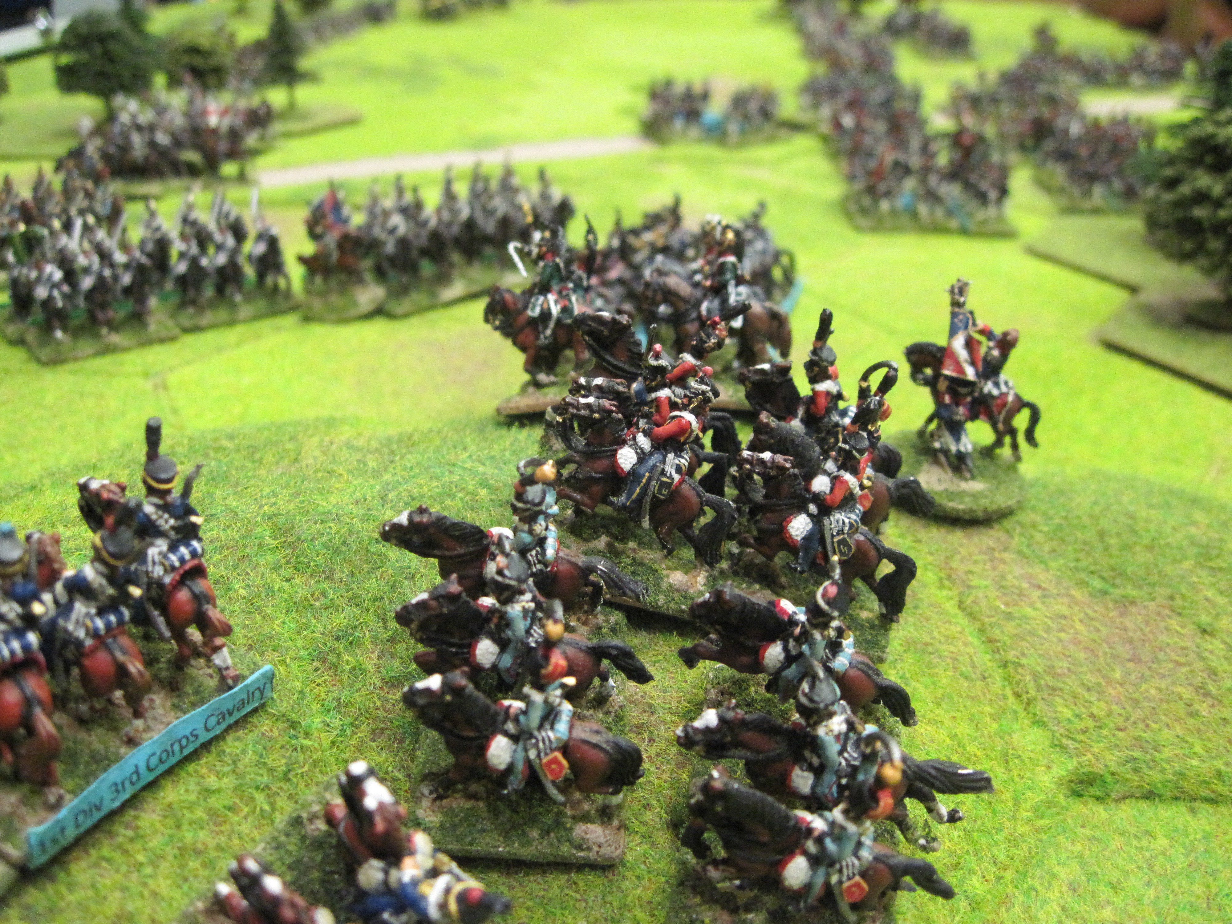 The French army (Tim and Tony) deployed first and Mick and I moved first - this was decided by di roll. The bulk of the French cavalry was positioned on their left so we matched this by placing all our cavalry on our right, but kept two squadrons of Hussars as reserve in case we needed to commit them elsewhere as events unfolded. Both armies positioned their infantry centrally, although three units of Russian Grenadiers were on our extreme right wing just beyond and in support of our massed cavalry.