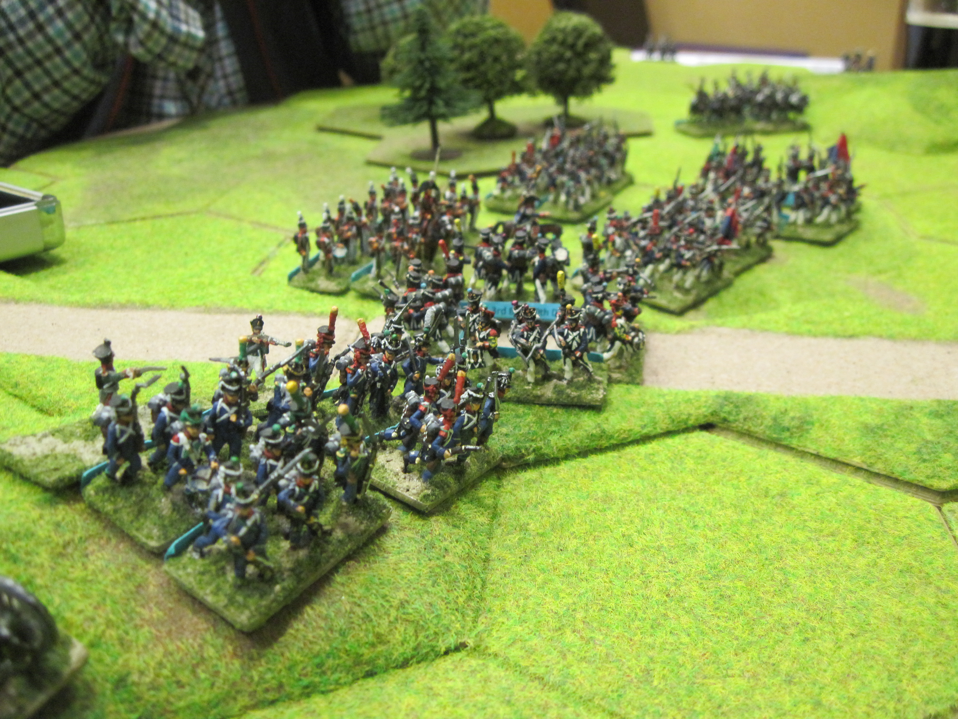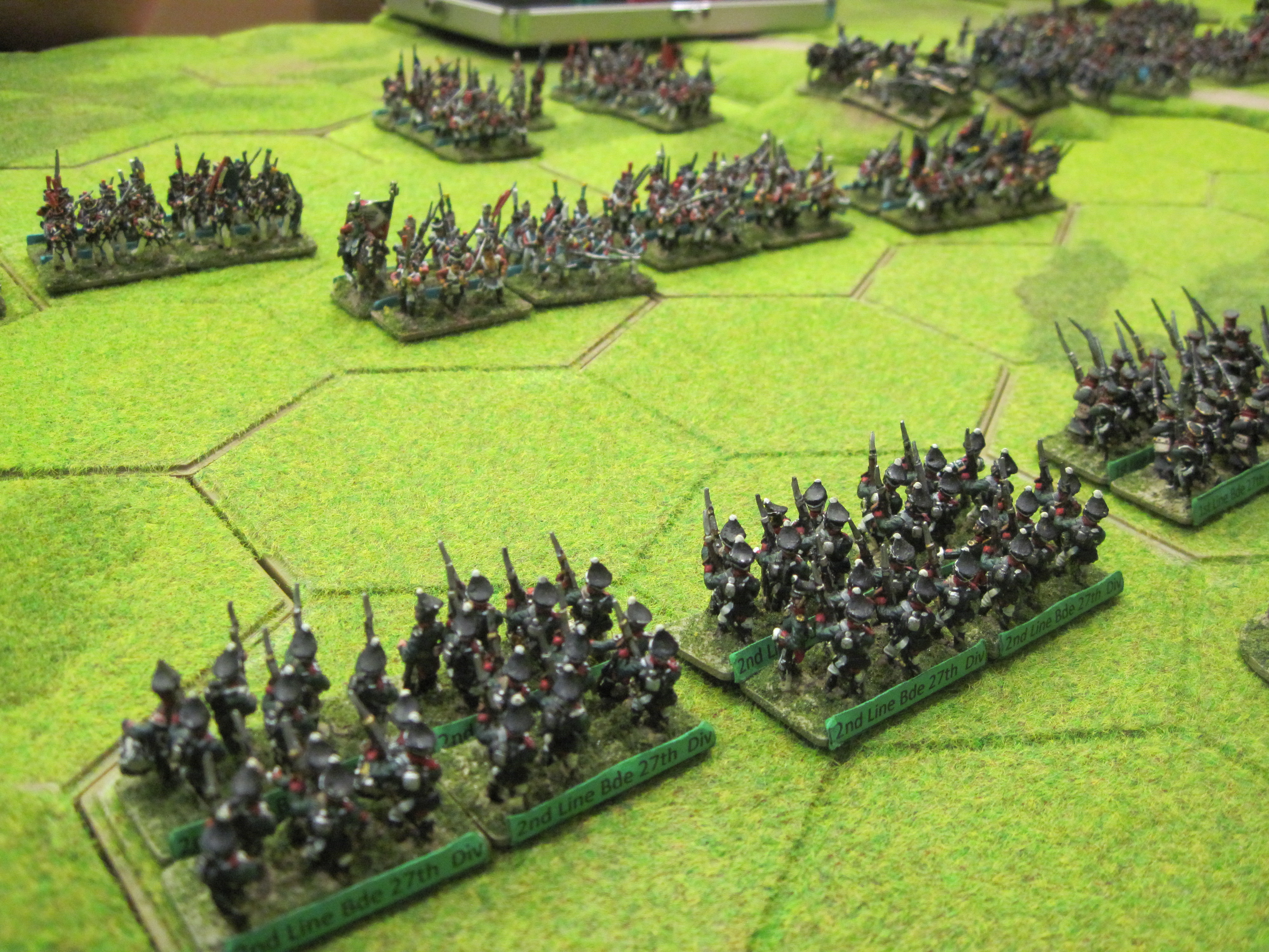 This rule system that we used for this game was a very 'slimmed' down version of a pretty comprehensive hex based system that Dave and Tony have have been working on for some time. The idea was to simplify things to a point where a large Napoleonic battle could be fought to a conclusion in a couple of hours or so. The full version includes lines one base deep, attack columns two base depth and march columns 4 base depth, skirmishers, victory points, role of built-up areas, unit support etc. The British or indeed any firing line could be two basas in a hex with a battalion extending across two hexes. This was very much a fast play experimental game, which, with a little further development could produce a very viable alternative to the full system, hopefully better suited to evening games of limited duration.