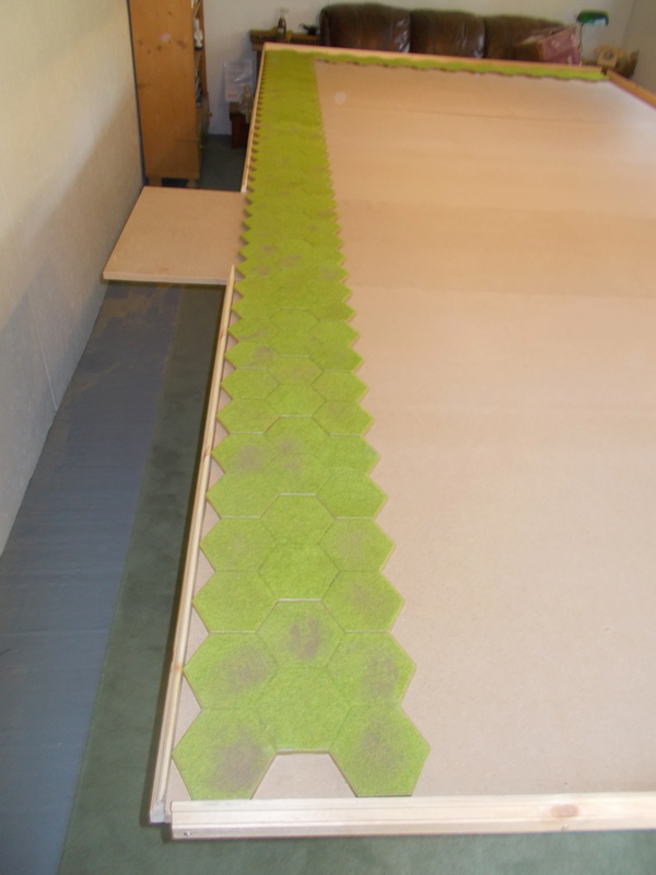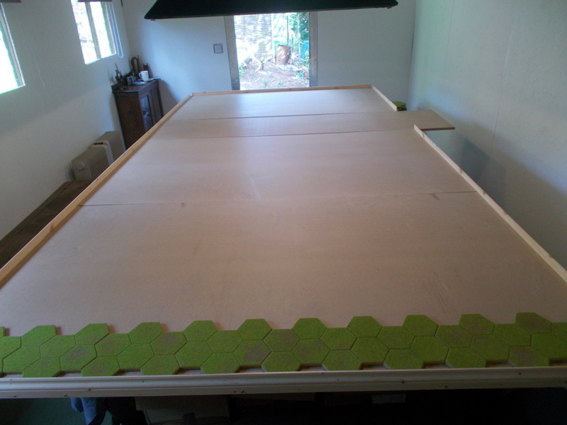 Here is the finished gaming table ready for the Hexon treatment. 14ft x 7ft or 8 hexon tiles wide (24 Hexes) by 21 tiles long (42 Hexes)