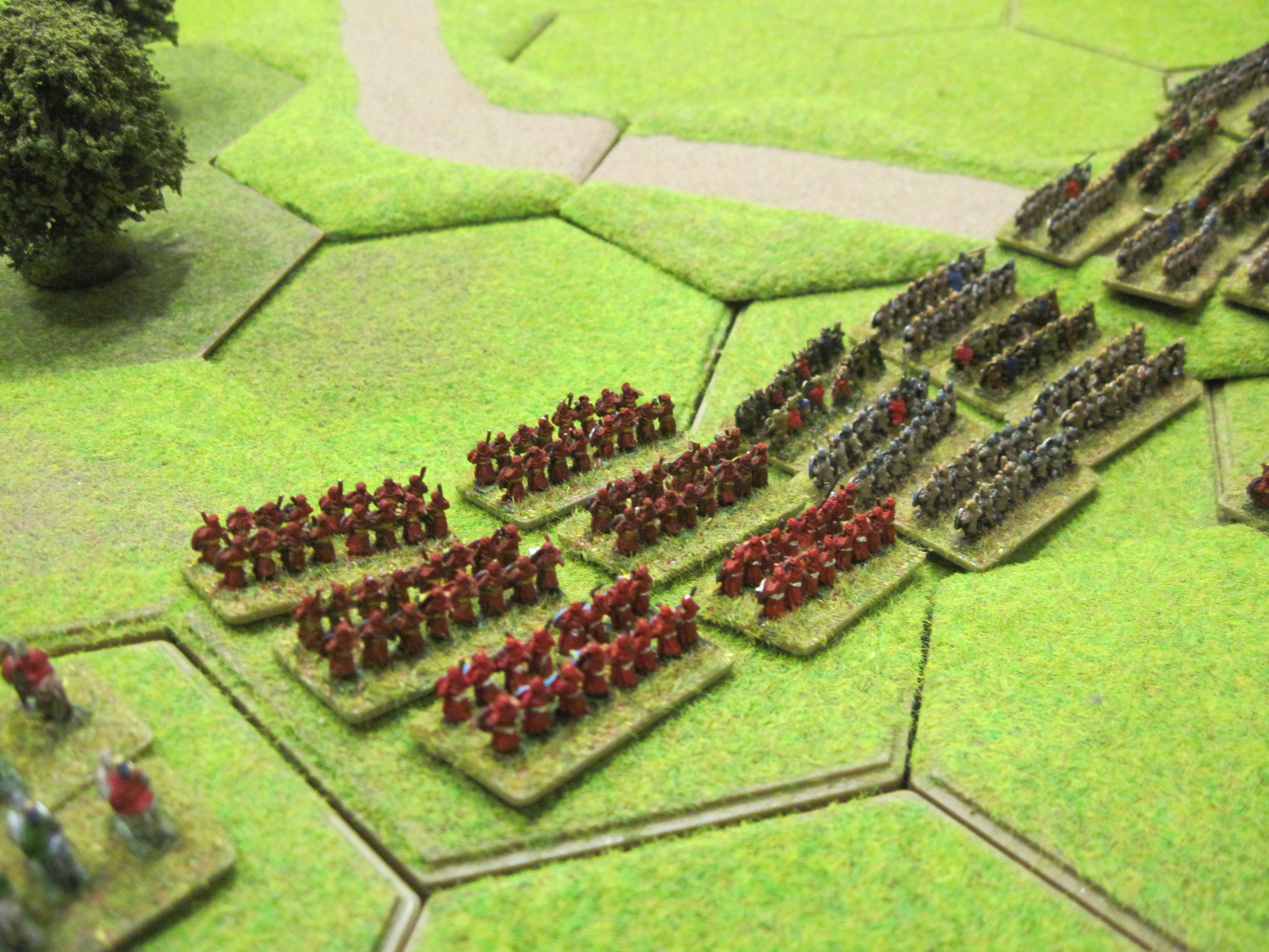 We Gallic commanders put our heads together and came up with a sort of plan; advance quickly and take control of the three areas of woodland, which would hopefully give our units a better chance against the Roman heavy infantry which could not voluntarily enter woodland hexes. Our quick moving 6 stand units of Gallic warriors soon gained ground on the Romans and we moved our 2 units of cavalry opposite their Roman counterparts.
