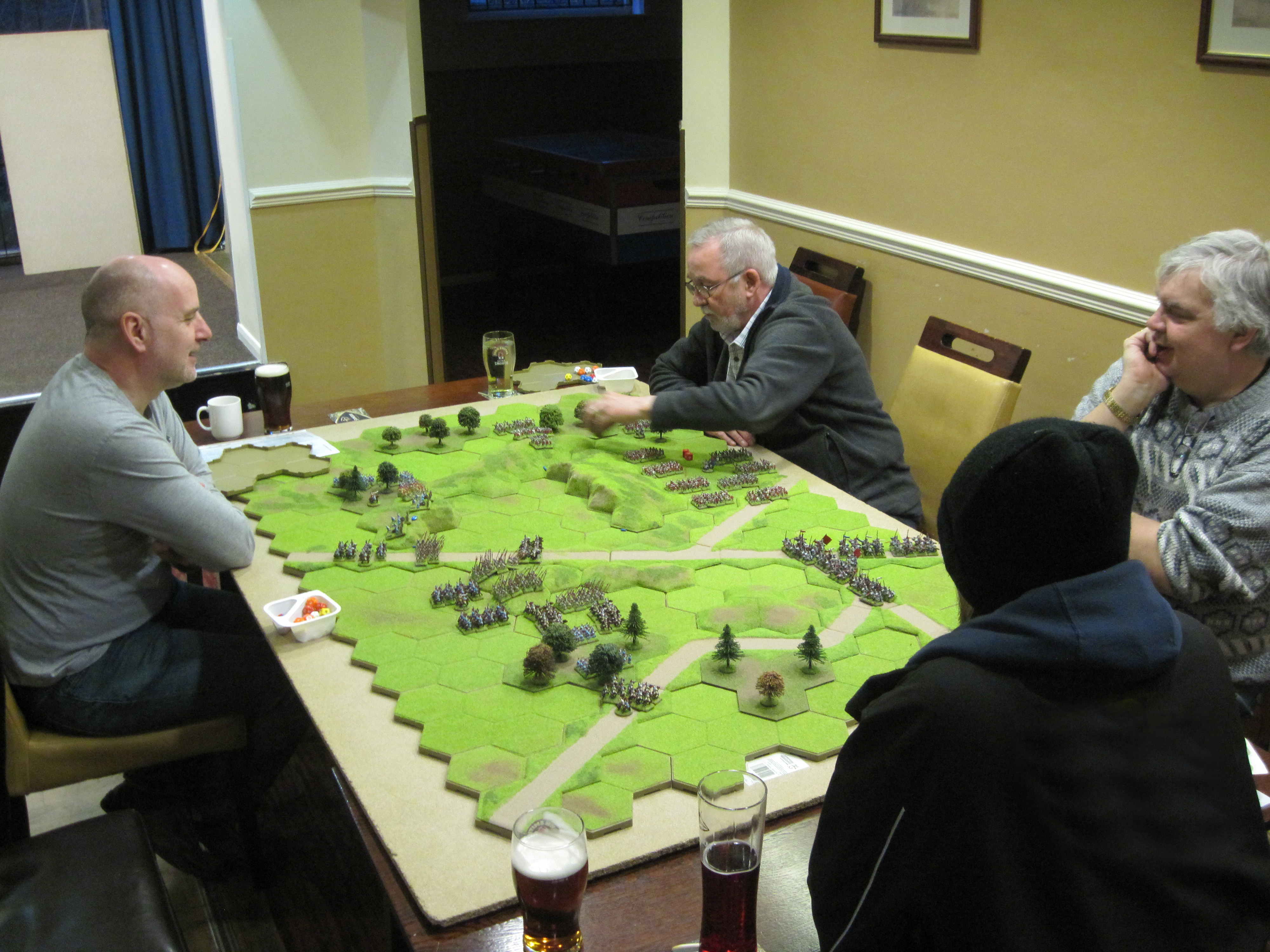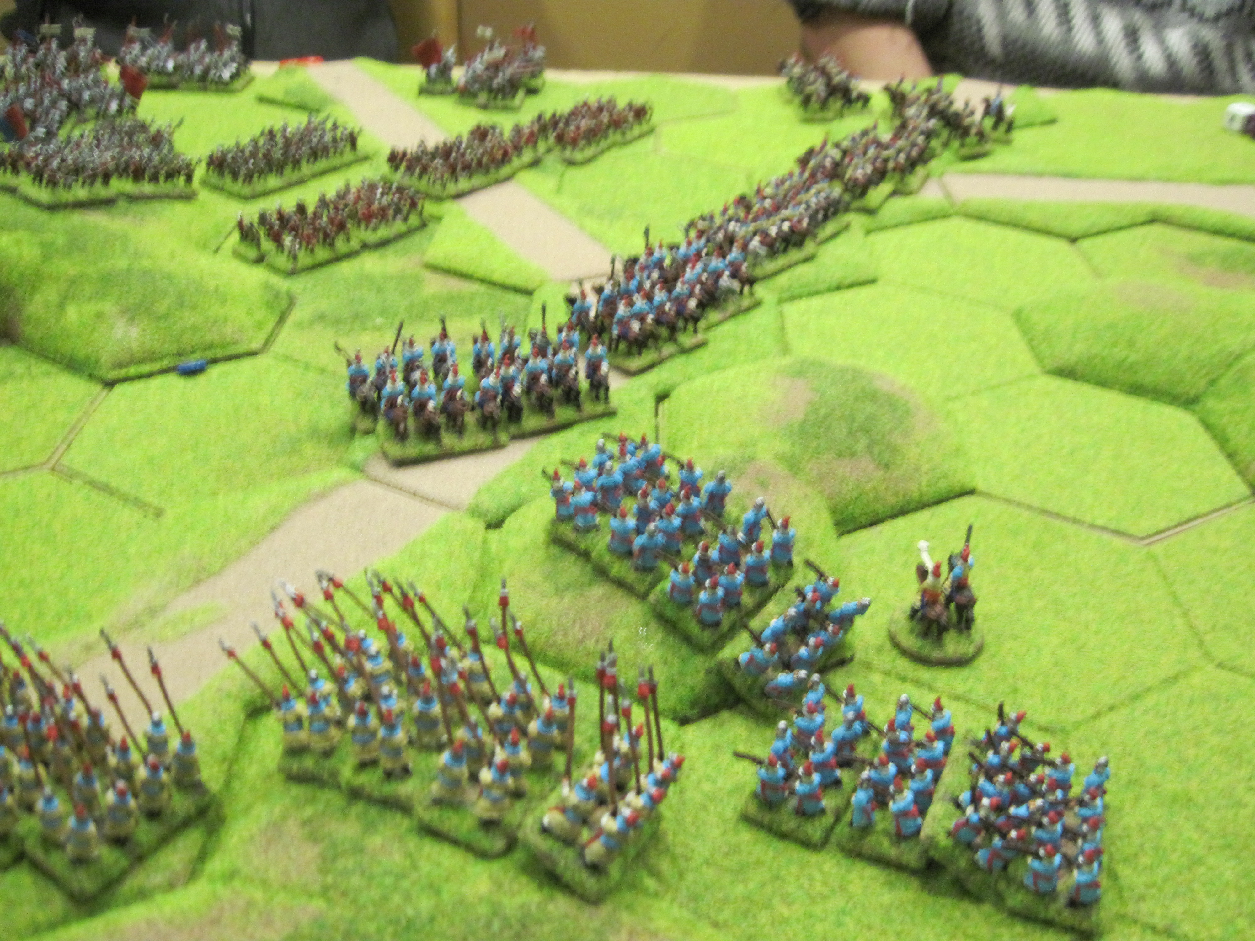 The terrain gave opportunities for both sides with Tony and Dave (Yorkist), choosing the table edge with a very defensible 8 hex escarpment. Chris and I (The Koreans), won the di roll for first move and used this to gain plenty of ground with our cavalry. Areas of woodland on both sides, and towards the table edges would restrict the areas in which the Yorkist and Korean cavalry could operate effectively, and as a result the ‘action’ would be destined to take place in the centre and centre left of the field.